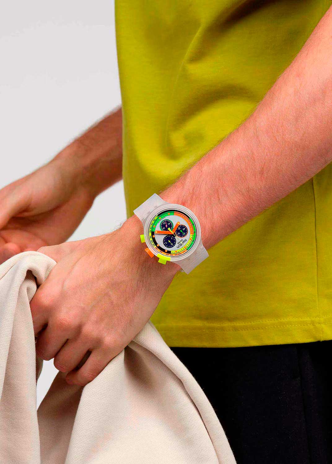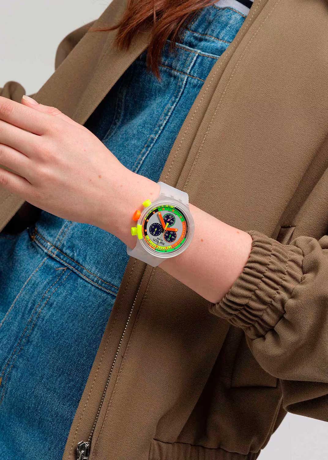 Массивные унисекс часы-хронограф с секундомером и тахиметром Swatch Neon Jelly. Круглый корпус из прозрачного пластика. Матовый циферблат. Метки в виде точек. Часовая и минутная стрелки оранжевого цвета, а также желтая секундная с люминесцентным покрытием, которое светится в темноте после непродолжительной зарядки на свету. Оранжевая рифленая заводная головка и желтые пуш-кнопки. Прозрачный фактурный силиконовый ремешок с желтой классической пряжкой из алюминия.