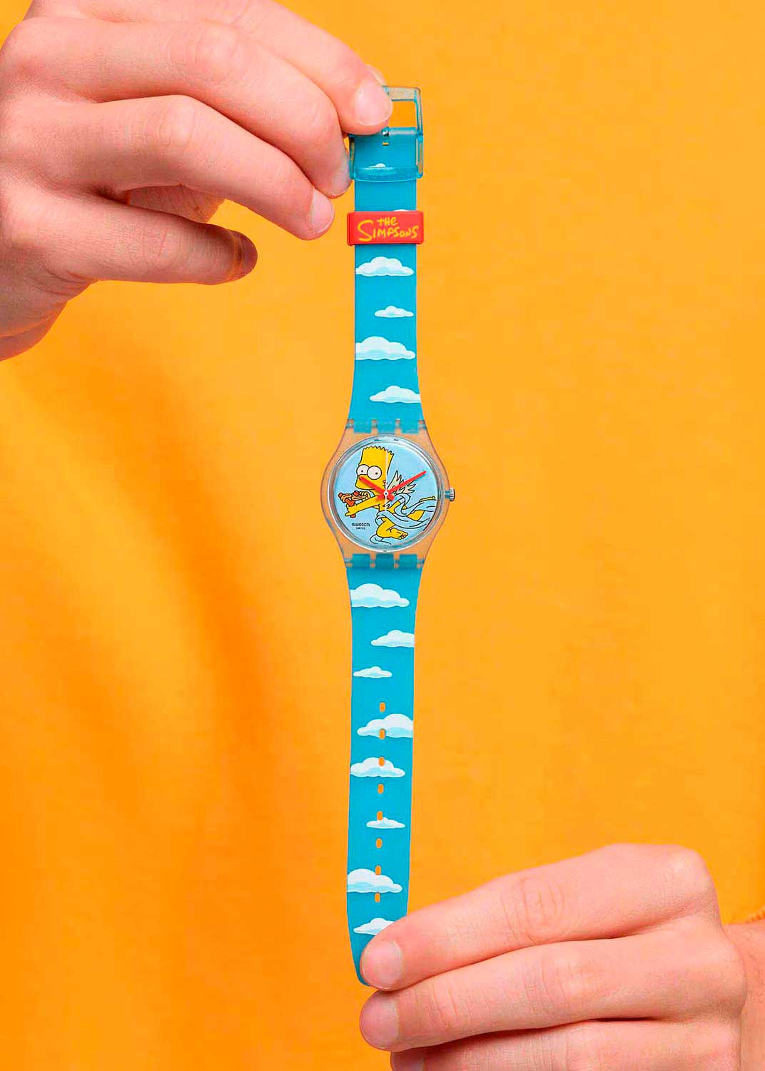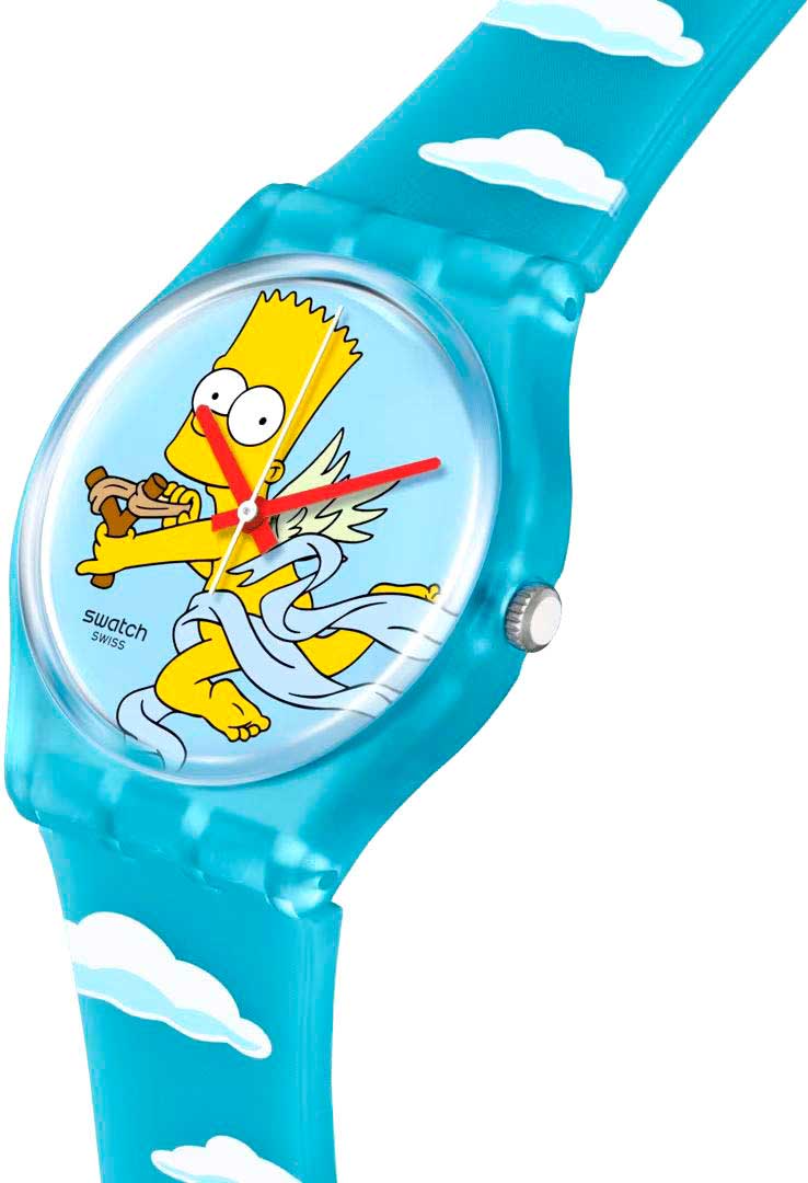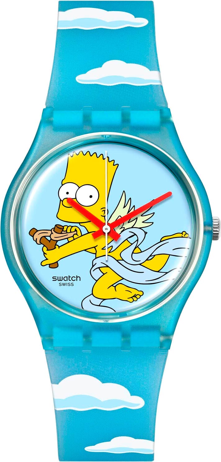 Наручные кварцевые унисекс часы Angel Bart из коллекции The Simpsons. Модель выпущена специально ко Дню святого Валентина. Круглый корпус из прозрачного пластика. Циферблат без меток украшен изображением Барта Симпсона (Bart Simpson) в образе Купидона. Скругленные красные прямоугольные стрелки в стиле Baton. Стекло из многослойного акрила. Рифленая заводная головка. Силиконовый ремешок с принтом в виде облаков и красным тренчиком с логотипом The Simpsons. Классическая полимерная застежка.