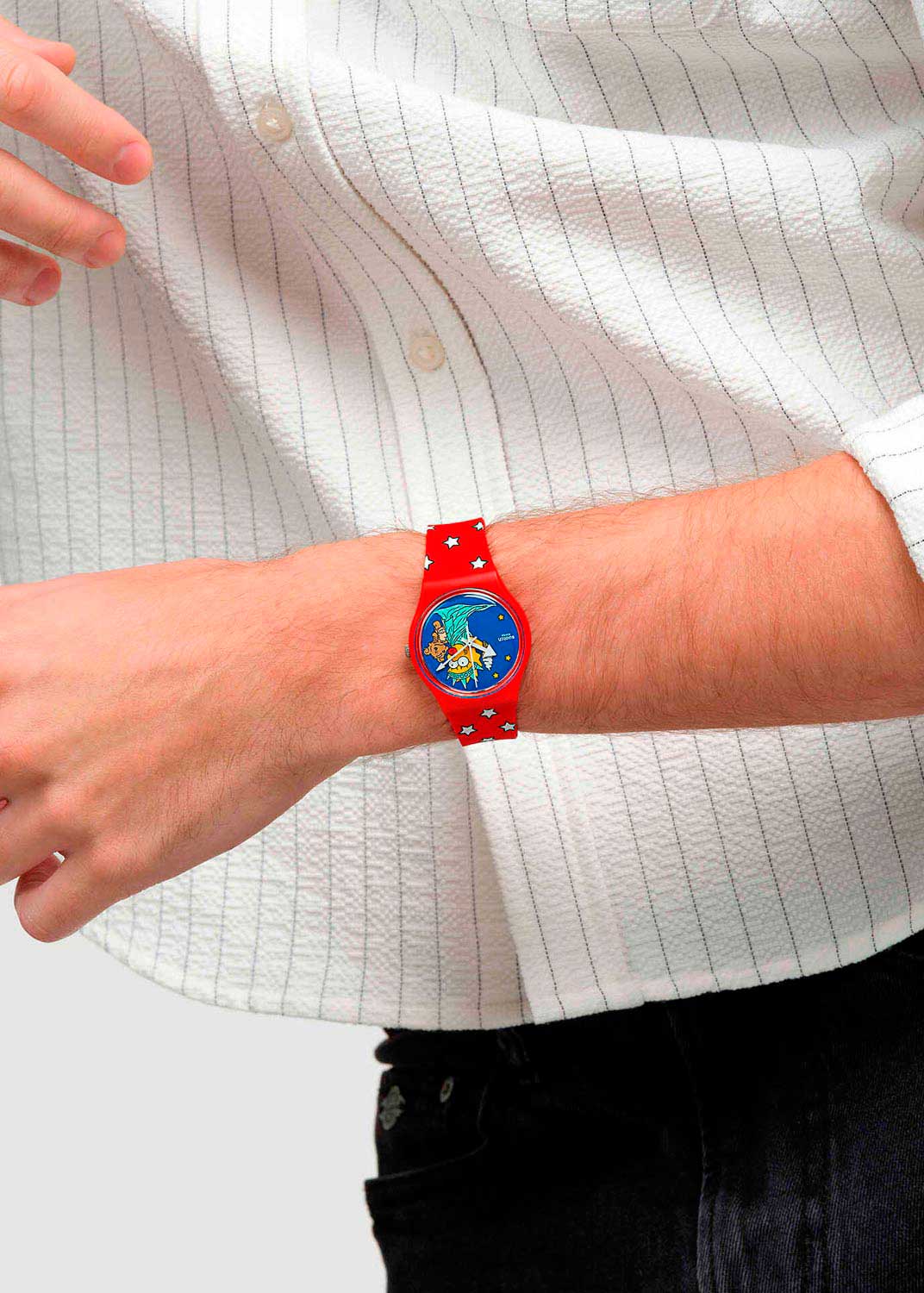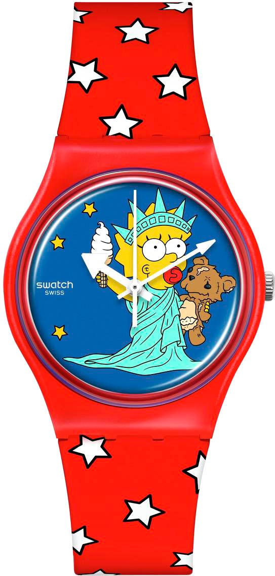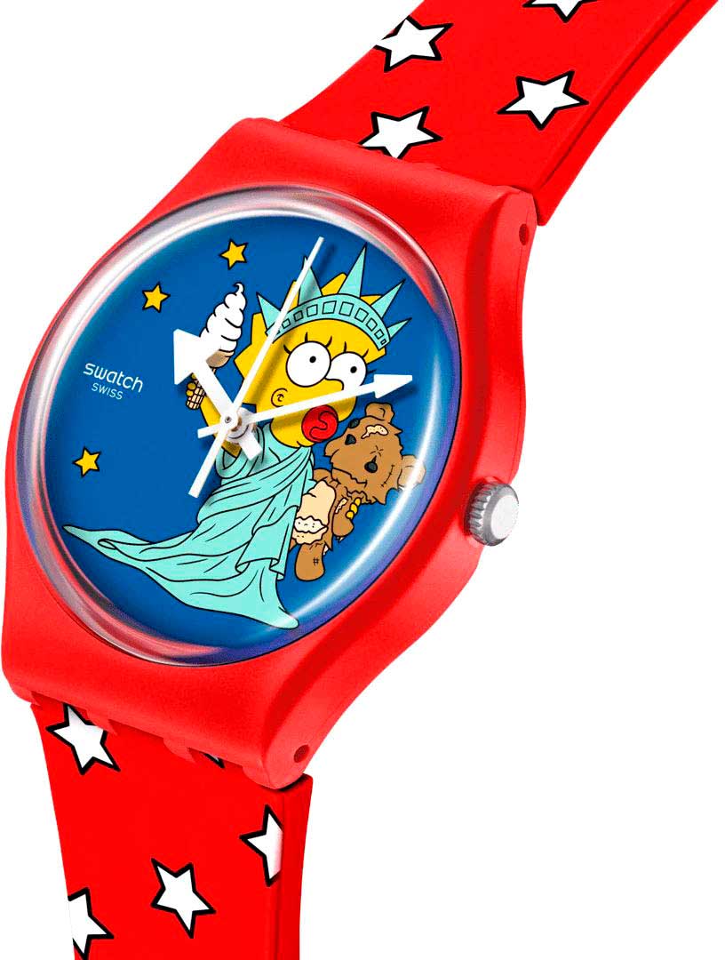 Наручные кварцевые унисекс часы Little Lady Liberty из коллекции The Simpsons. Модель приурочена к празднику 4 июля – Дню независимости США. Круглый матовый корпус из пластика. Циферблат без меток украшен изображением Мэгги Симпсон (Maggie Simpson), изображающей Статую Свободы. Стекло из многослойного акрила. Рифленая заводная головка. Силиконовый ремешок с принтом в виде сине-белых звезд и синим тренчиком с логотипом The Simpsons. Классическая полимерная застежка.