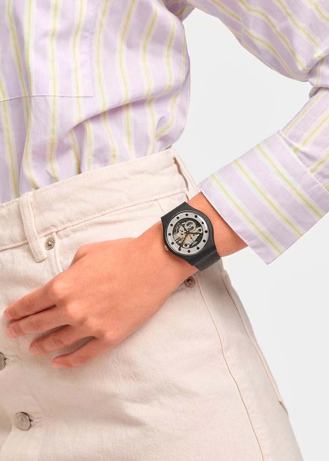 Эти стильные часы с современным дизайном станут прекрасным подарком. Скелетонизированные часы Silver Glam. Унисекс. Круглый корпус из пластика. Метки в виде точек. Стекло из многослойного акрила. Пластиковый ремешок с классической застежкой.