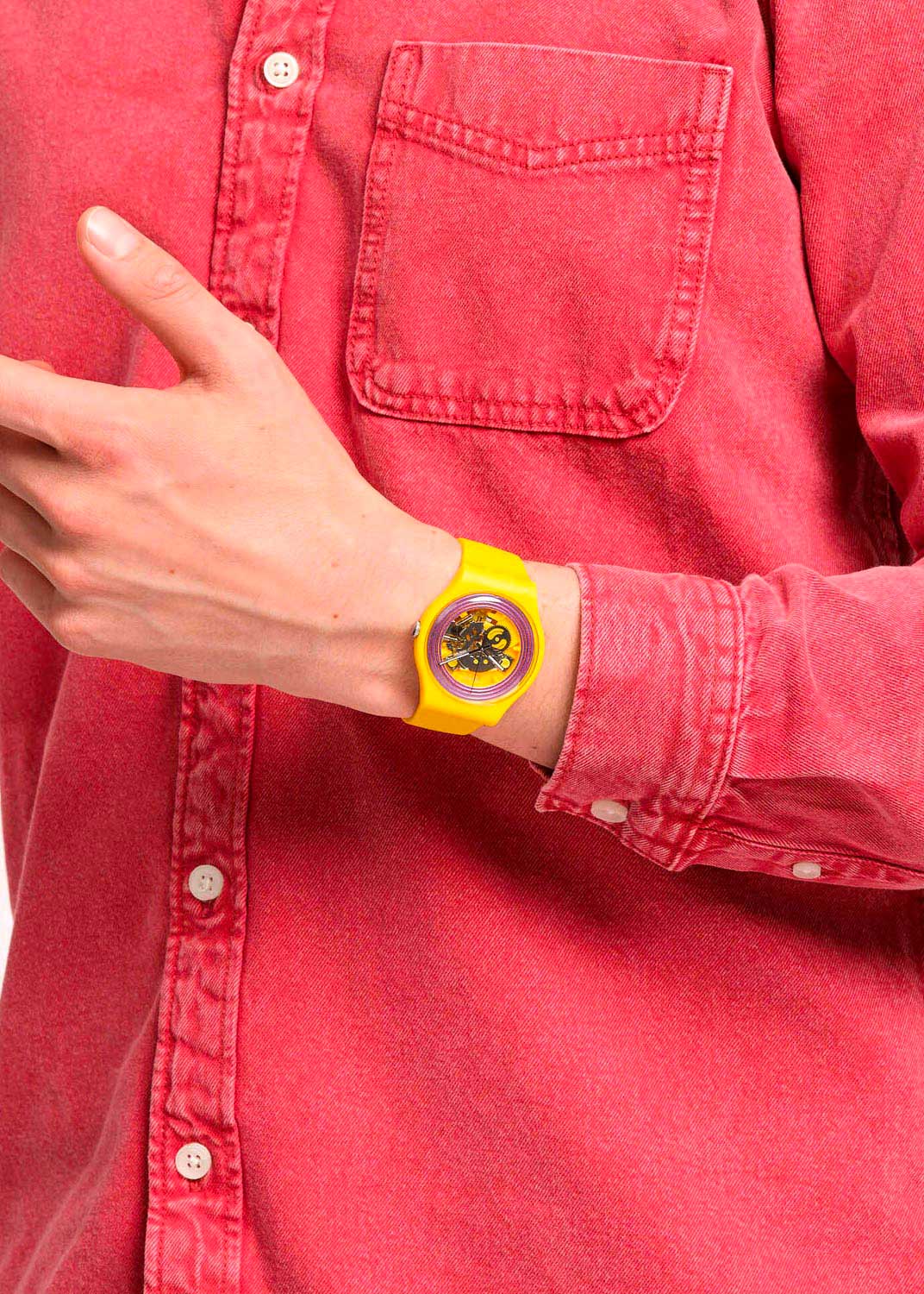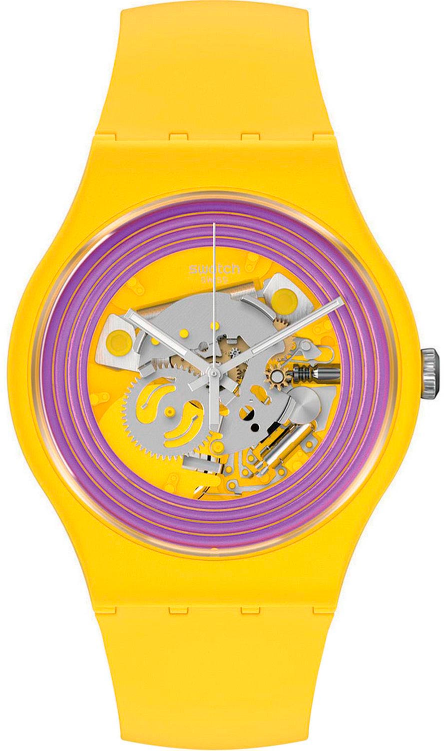 Наручные скелетонизированные унисекс часы Purple Rings Yellow. Круглый корпус из матового пластика. Двухуровневый скелетонизированный циферблат без меток. Прямоугольные стрелки с люминесцентным эффектом Swatch Glow. Стекло из многослойного акрила. Рифленая заводная головка. Силиконовый ремешок с классической полимерной застежкой.