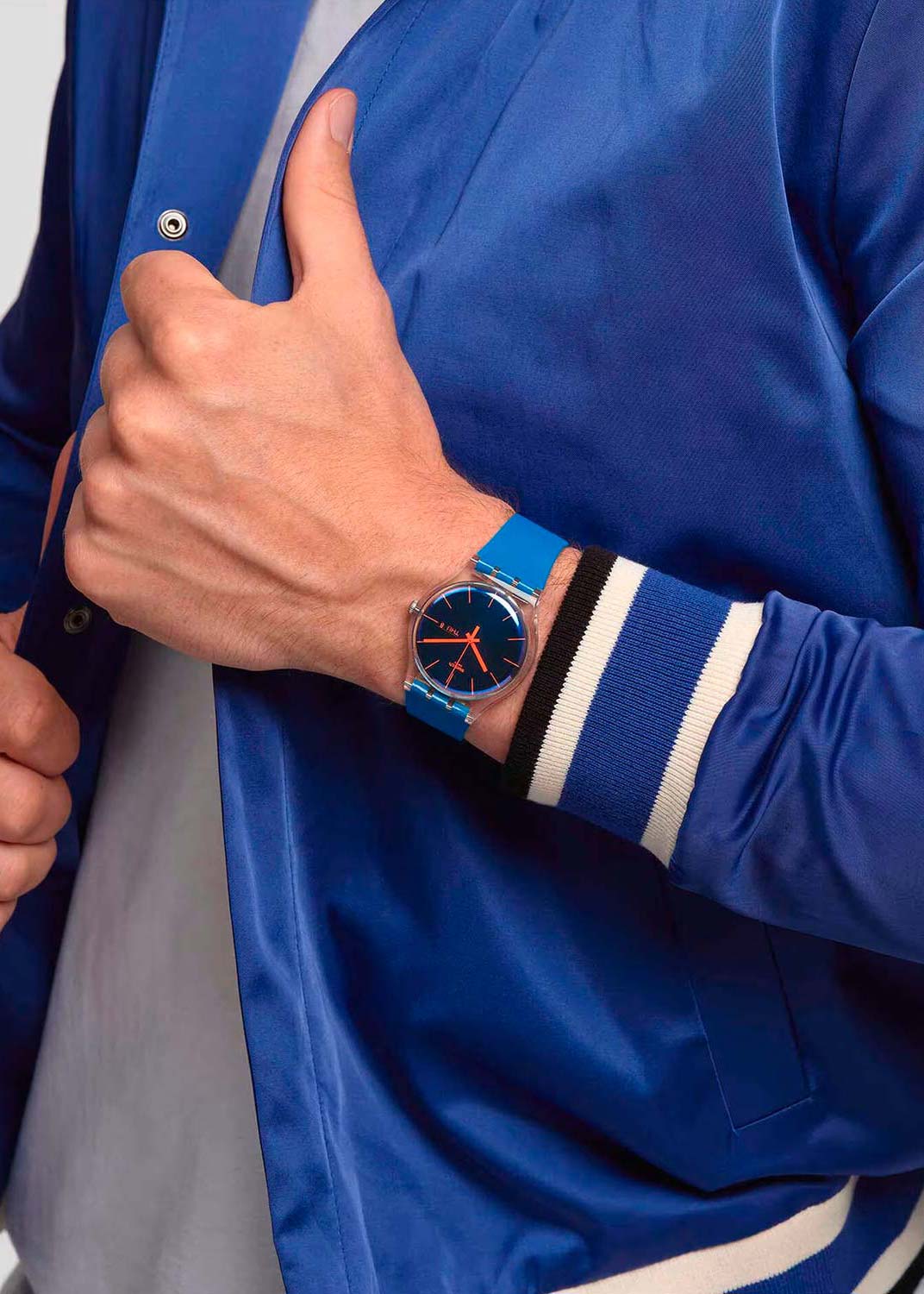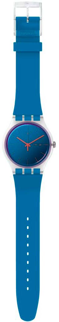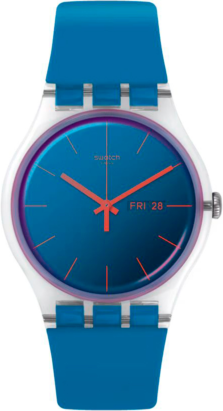 Яркий дизайн часов станет завершающим штрихом в вашем повседневном образе. Polablue. Унисекс. Круглый корпус из пластика. Метки в виде штрихов. Окошко даты и дня недели. Стекло из многослойного цветного акрила Swatch Solar Spectrum. Силиконовый ремешок с классической застежкой.