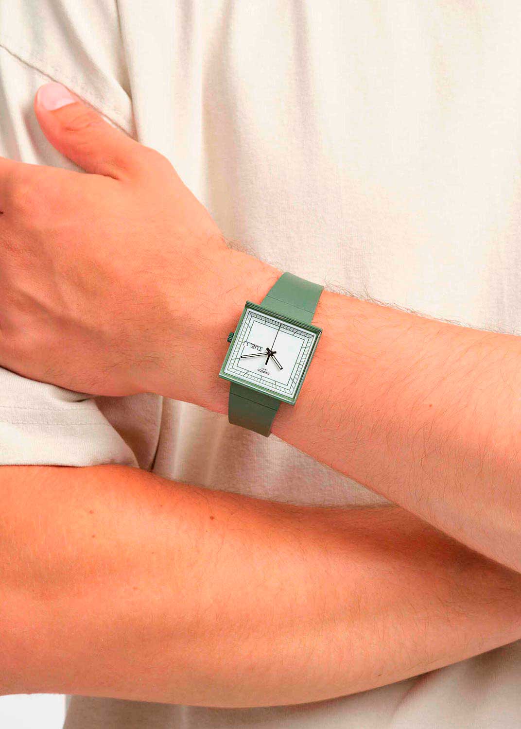 Наручные кварцевые унисекс часы What if…green? Квадратный матовый корпус из пластика. Матовый циферблат с метками в виде штрихов. Окошко даты и дня недели в положении 3 часа. Прямоугольные стрелки в стиле Baton с люминесцентным покрытием, которое светится в темноте после непродолжительной зарядки на свету. Стекло из многослойного акрила покрывает корпус так, что позволяет смотреть на индексы часов сбоку. Рифленая заводная головка. На задней крышке часов изображен циферблат одного из первых прототипов, послужившего вдохновением при создании этих часов с квадратным циферблатом. Силиконовый ремешок с классической застежкой.