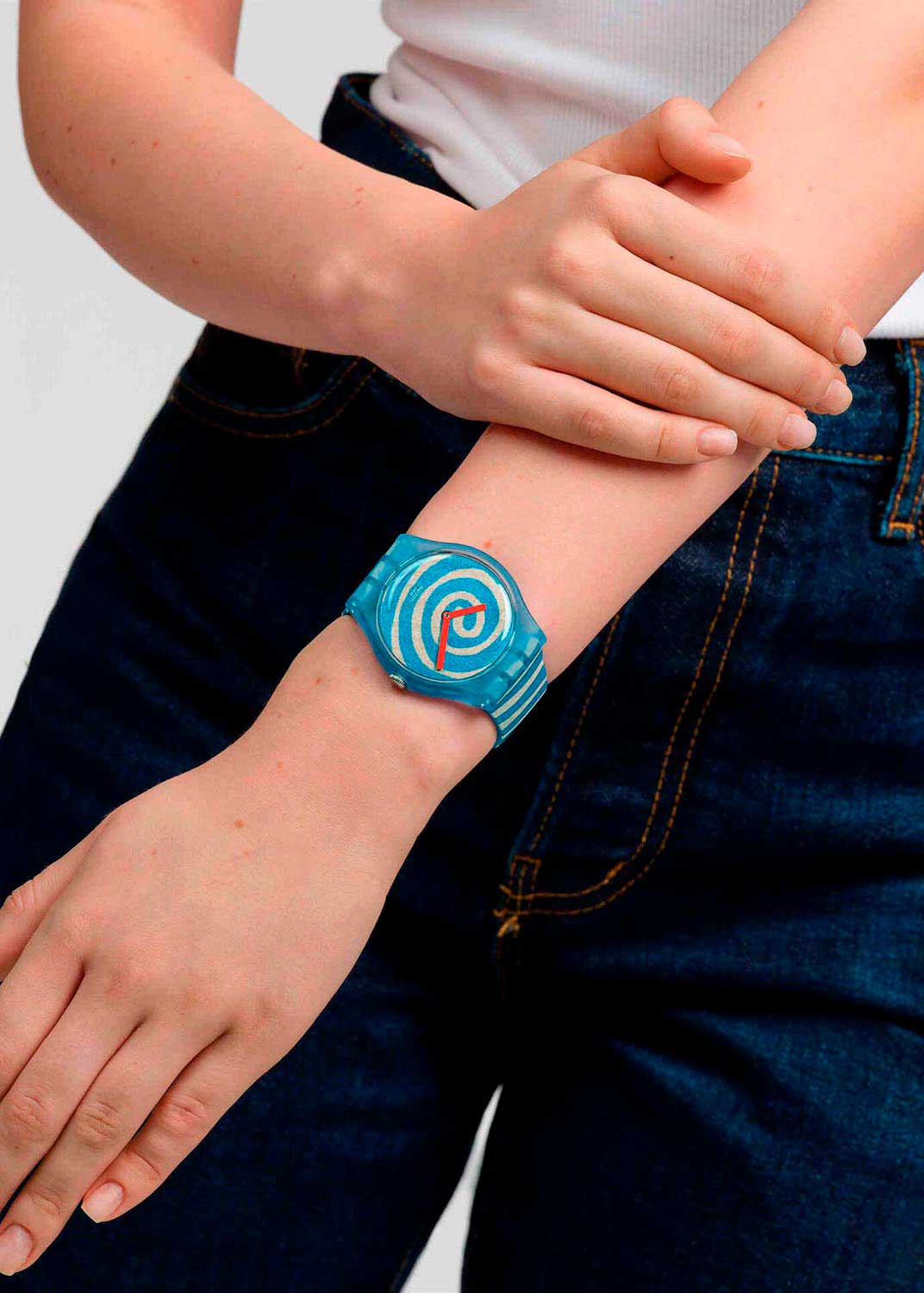 Дизайнерские наручные часы унисекс Bourgeois's Spirals. Модель создана с принтом с репродукцией картины Луизы Буржуа (Louise Bourgeois) ''SPIRALS'' (''Спирали''). Круглый корпус из прозрачного матово-голубого пластика. Метки отсутствуют. Скругленные прямоугольные красные стрелки в стиле Baton. Стекло из многослойного акрила. Рифленая заводная головка. Силиконовый ремешок с прозрачным матовым тренчиком украшенным логотипом Tate Gallery. Классическая полимерная застежка.
