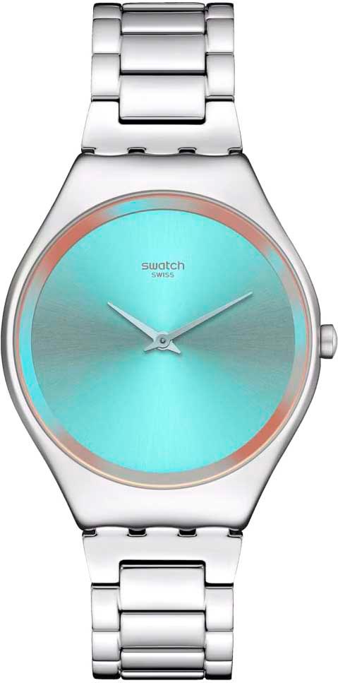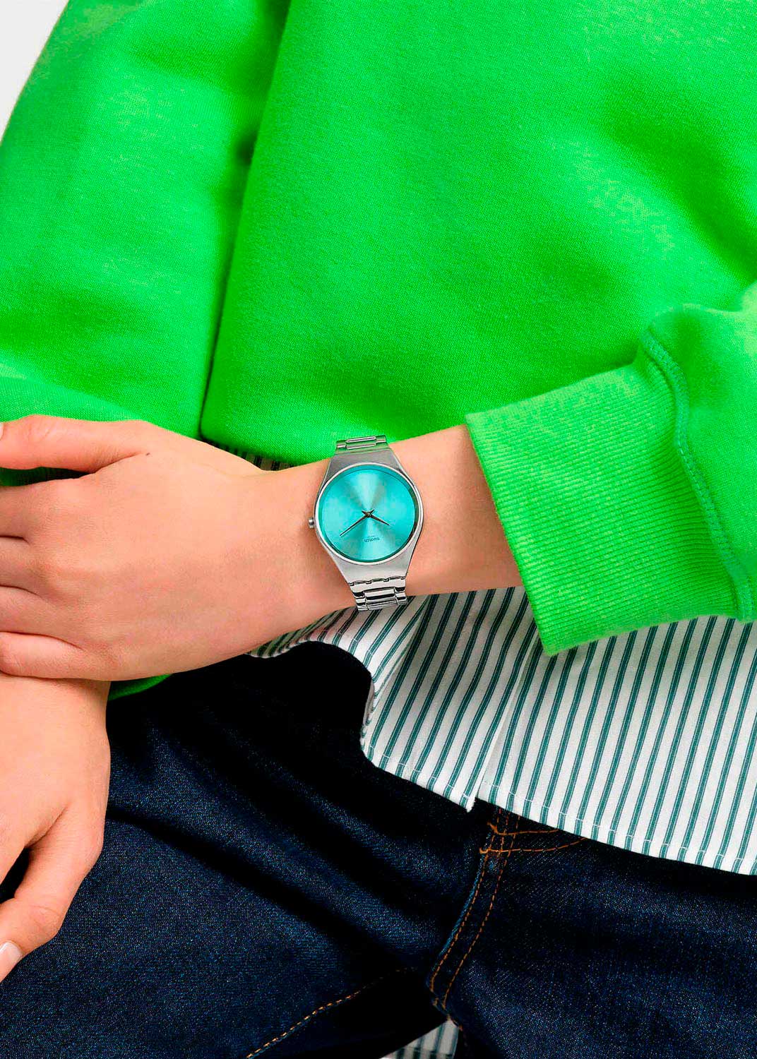 Ультратонкие кварцевые унисекс часы The Glow Of Irony. Круглый стальной корпус. Циферблат выполнен по технологии Sunray (солнечные лучи). Метки отсутствуют. Острые серебристые стрелки в стиле Alpha. Стекло из многослойного цветного акрила Swatch Solar Spectrum. Миниатюрная гладкая заводная головка. Надежный стальной браслет с раскладывающейся застежкой.