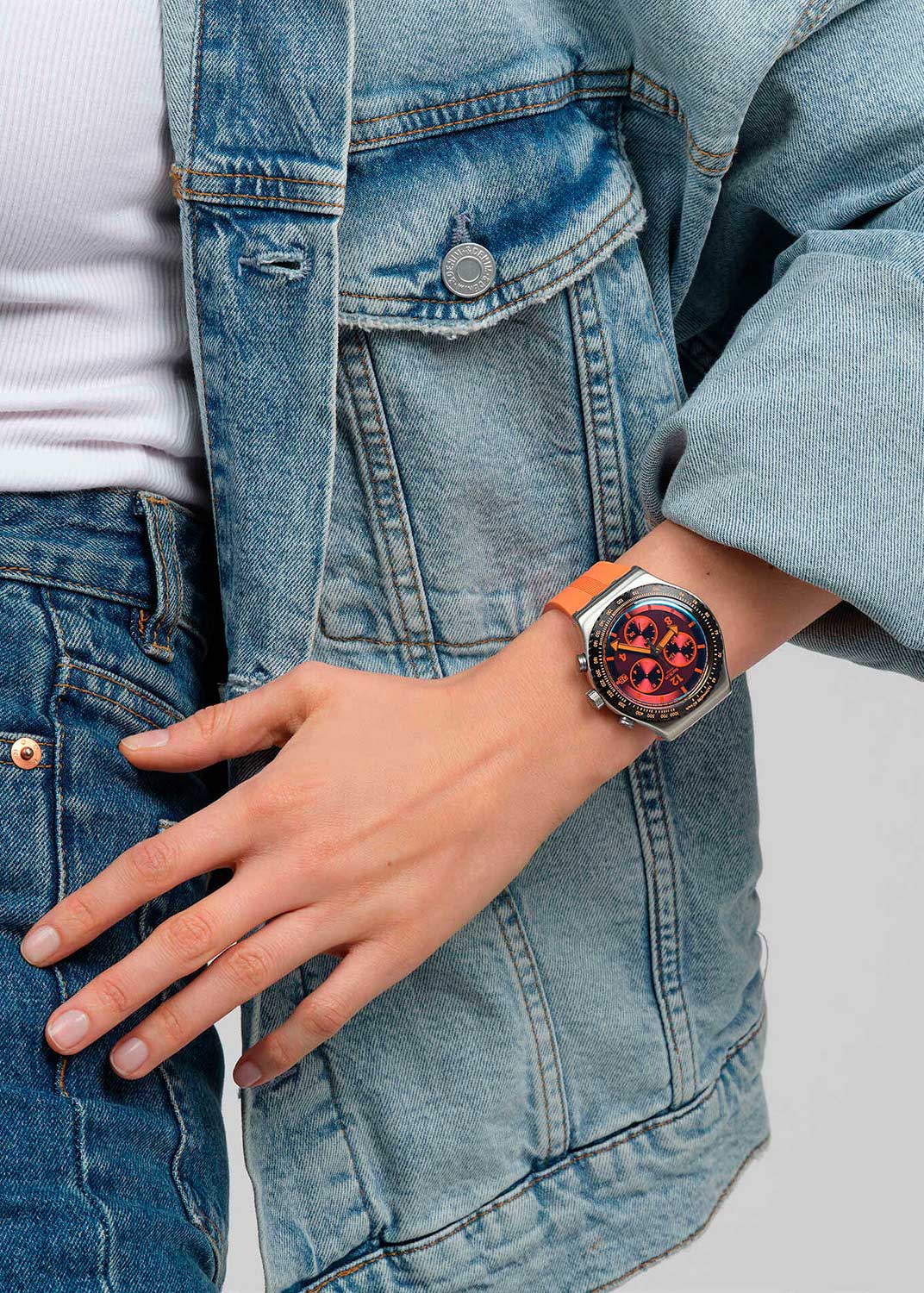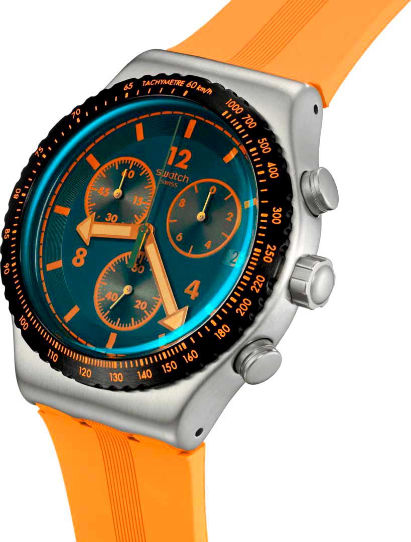 Массивные унисекс часы-хронограф с секундомером и тахиметром Tangerine Tiger. Круглый матовый стальной корпус. Безель с тахиметрической шкалой. Матовый циферблат. Метки в виде штрихов и арабских цифр. Прямоугольные стрелки в стиле Baton с наконечниками с люминесцентным покрытием, которое светится в темноте после непродолжительной зарядки на свету. Окошко даты находится в положении 6 часов. Стекло из многослойного цветного акрила Swatch Solar Spectrum. Заводная головка в форме болта. Силиконовый ремешок с классической стальной застежкой.
