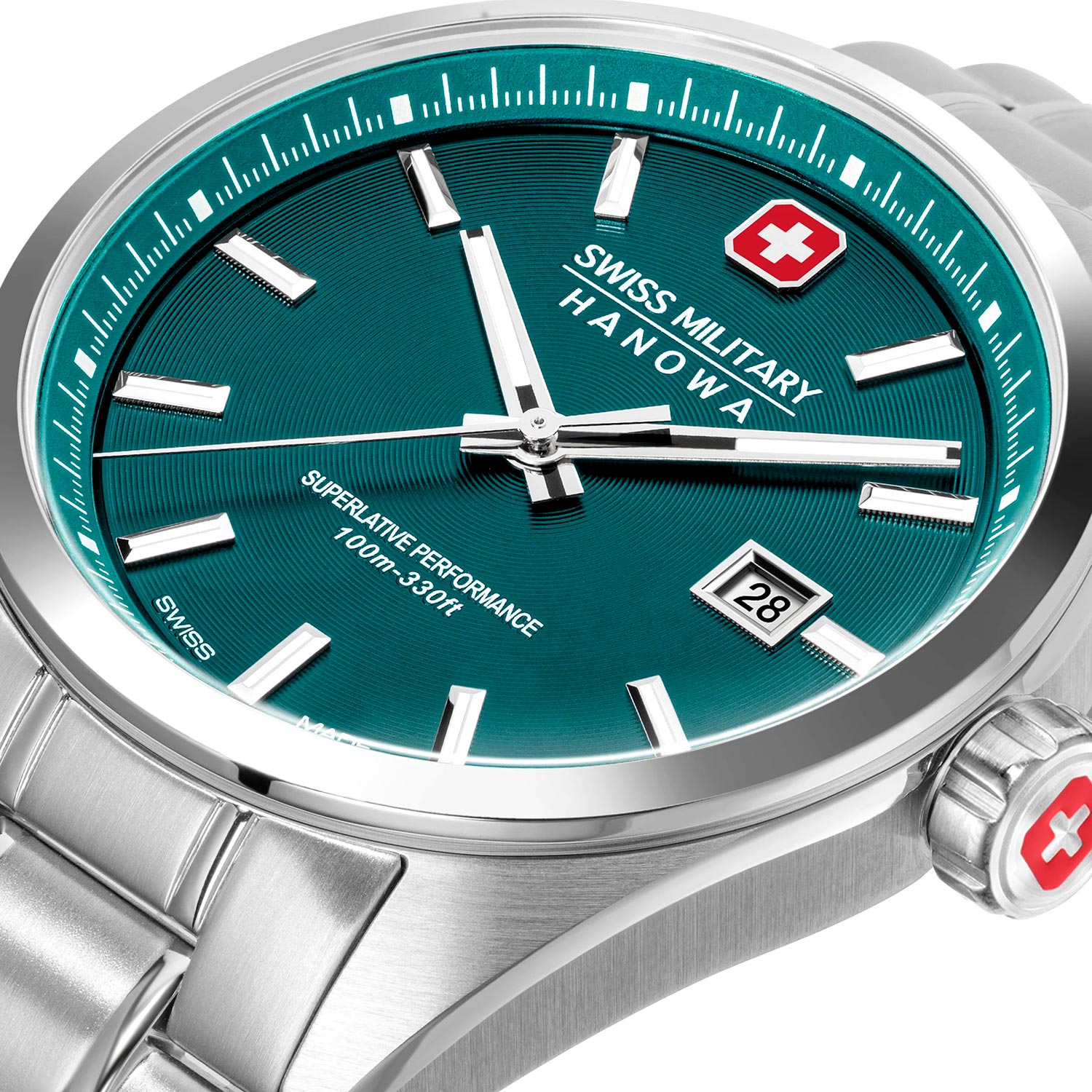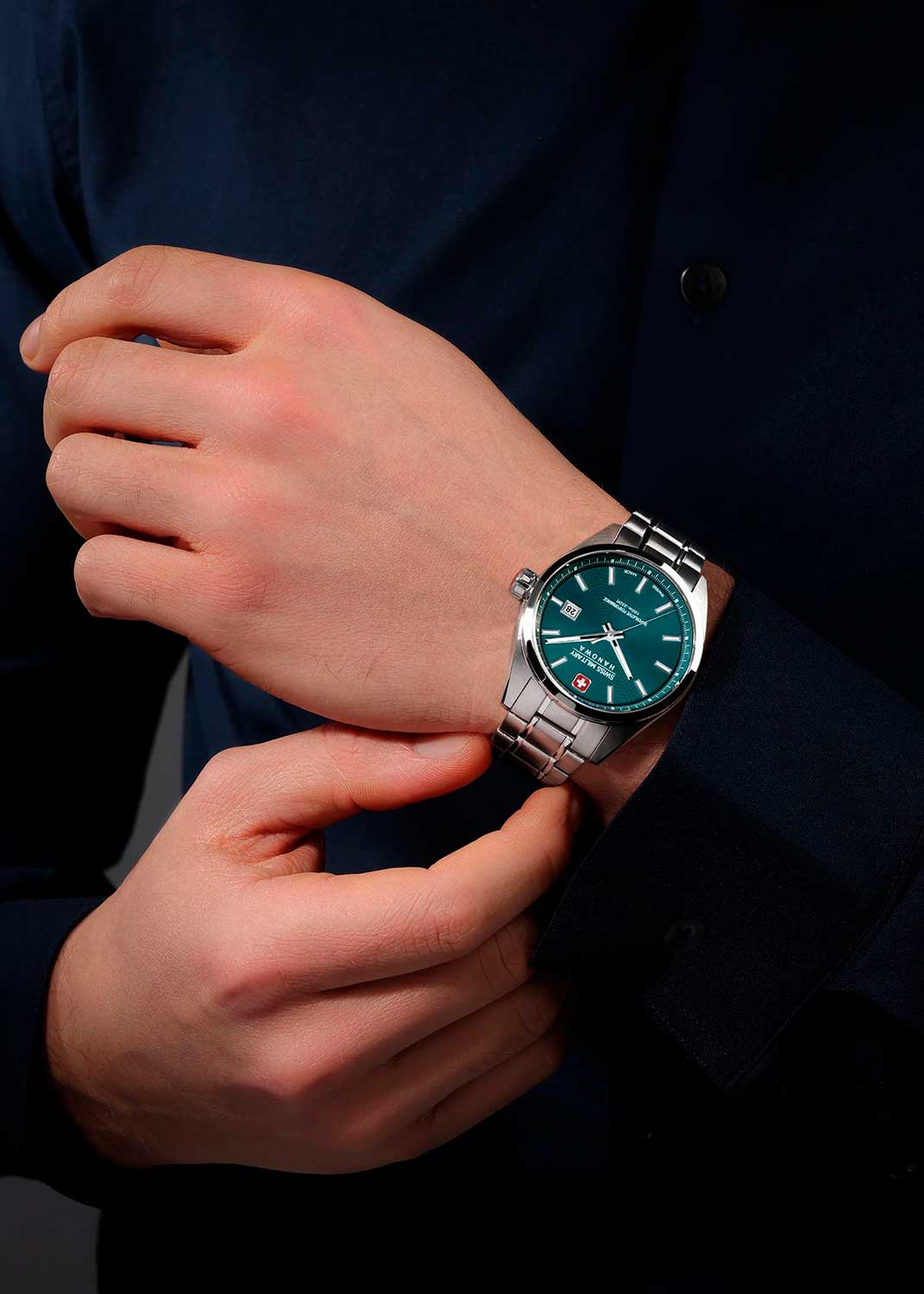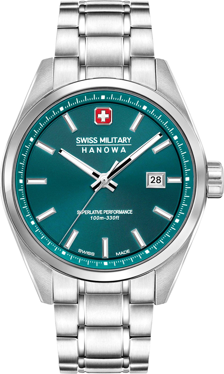 Мужские часы Pioneer с круглым стальным корпусом. Циферблат с круговым линейным дизайном дополнен фирменным логотипом Swiss Military Hanowa. Накладные метки в виде штрихов. Прямоугольные стрелки в стиле Baton. Метки и стрелки с люминесцентным покрытием, которое светится в темноте после непродолжительной зарядки на свету. Окошко даты находится в положении 3 часа. Рифленая заводная головка украшена фирменным логотипом. Завинчивающаяся задняя крышка. Стальной браслет с раскладывающейся застежкой.