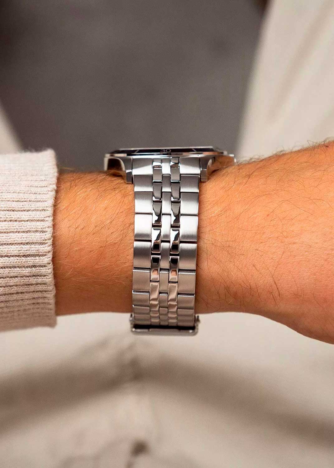 Окошко даты находится в положении 3 часа. Сапфировое стекло с антибликовым покрытием для лучшей читаемости при любом освещении. Рифленая заводная головка с защитой. Завинчивающаяся задняя крышка. Стальной браслет с матовой и полированной обработкой. Раскладывающаяся застежка.