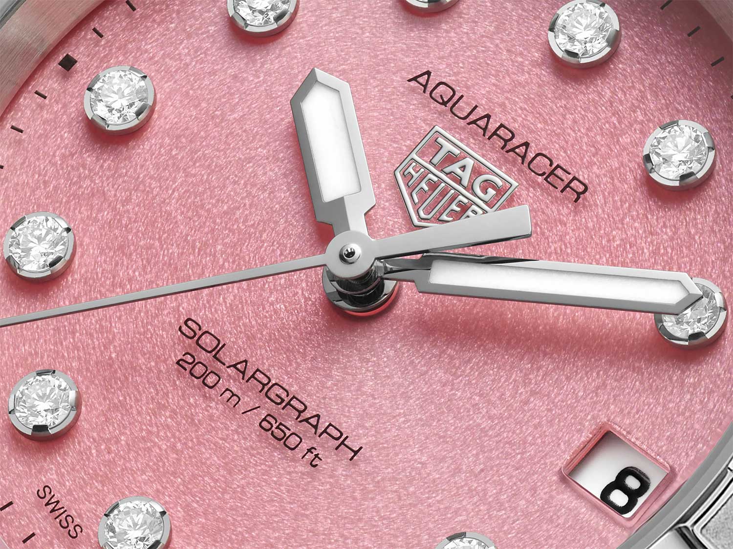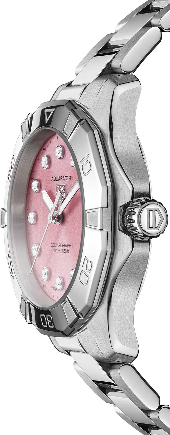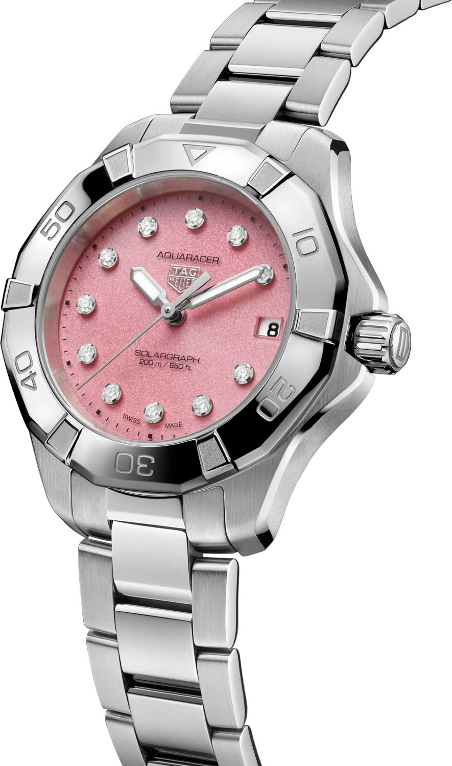 Женские часы Aquaracer Professional 200 Solargraph. Питание от солнечной энергии. Циферблат защищен прочным сапфировым стеклом. Накладные метки в виде точек, инкрустированных бриллиантами. Стрелки с люминесцентным покрытием Super-LumiNova, которое светится в темноте после непродолжительной зарядки на свету.