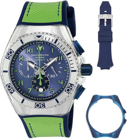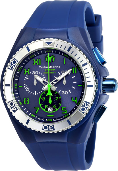 Этот стильный дайверский аксессуар станет яркой деталью вашей насыщенной жизни. Cruise California. Часы-хронограф с секундомером. Завинчивающаяся заводная головка с защитой. В комплекте сменные синее покрытие корпуса и синий силиконовый ремешок.