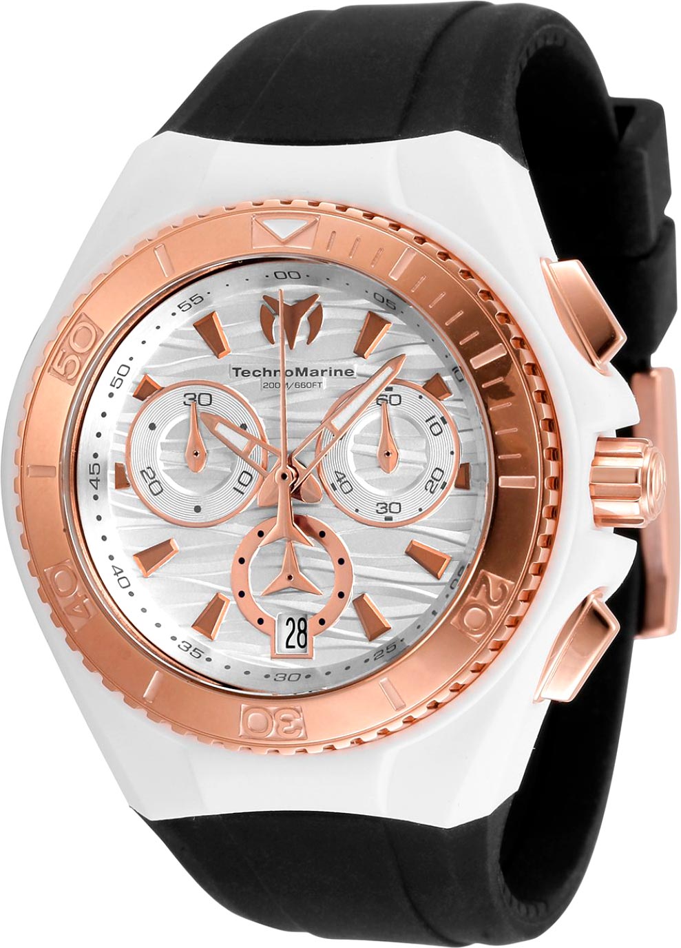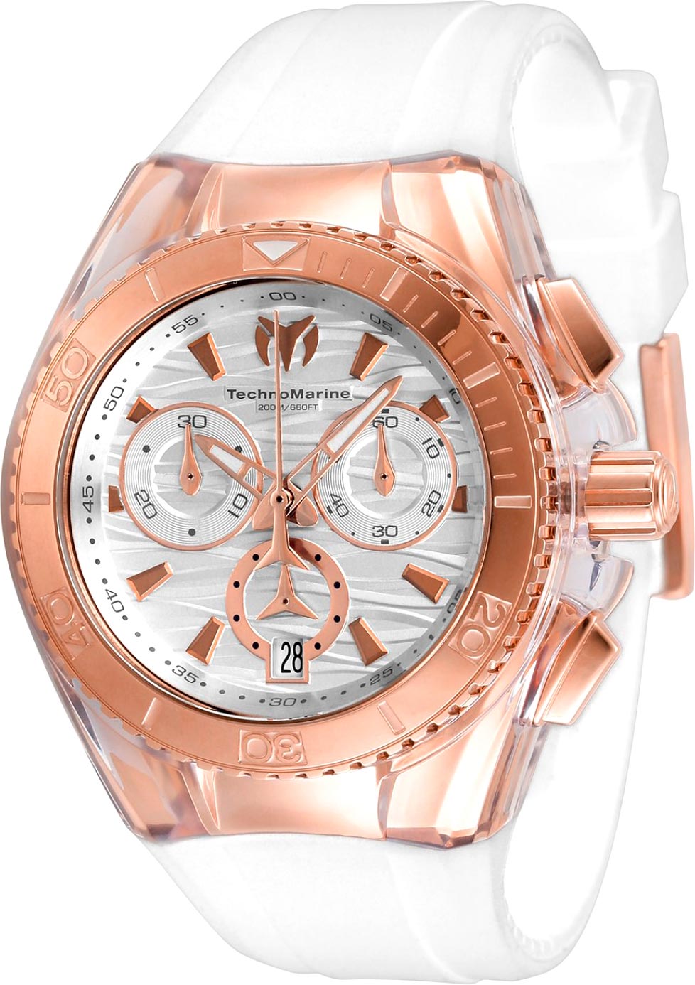В дизайне часов угадывается выразительность и подчеркнутая элегантность, и незаменимая функциональность. Не пропустите стильный аксессуар от TechnoMarine. Наручные часы-хронограф Cruise Star с секундомером. Круглый стальной корпус с прозрачной силиконовой накладкой. Безель вращается в одном направлении. Циферблат с дизайном в виде волн. На отметке 12 часов нанесен логотип компании ''TechnoMarine''. Накладные метки в виде штрихов. Окошко даты находится в положении 6 часов. Стрелки с люминесцентным покрытием, которое светится в темноте после непродолжительной зарядки на свету. Рифленая завинчивающаяся заводная головка с защитой. В комплекте сменные белое покрытие корпуса и черный силиконовый ремешок. Классическая застежка.