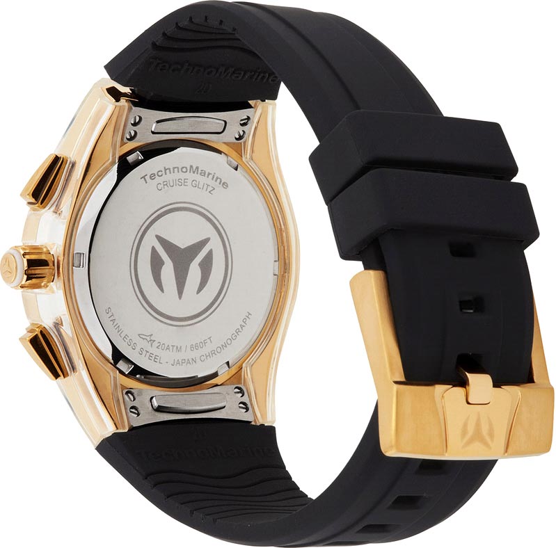 Выразительный дизайн делает эту модель особым украшением вашей руки. Мужские наручные часы-хронограф Cruise Glitz с секундомером. Специальная серия. Круглый стальной корпус с прозрачной силиконовой накладкой. Безель украшен кристаллами. Циферблат выполнен по технологии Sunray (солнечные лучи) с логотипом компании TechnoMarine. Накладные метки в виде штрихов. Окошко даты находится в положении между отметками 4 и 5 часов. Стрелки с люминесцентным покрытием, которое светится в темноте после непродолжительной зарядки на свету. Рифленая завинчивающаяся заводная головка с защитой. Силиконовый ремешок с классической застежкой.