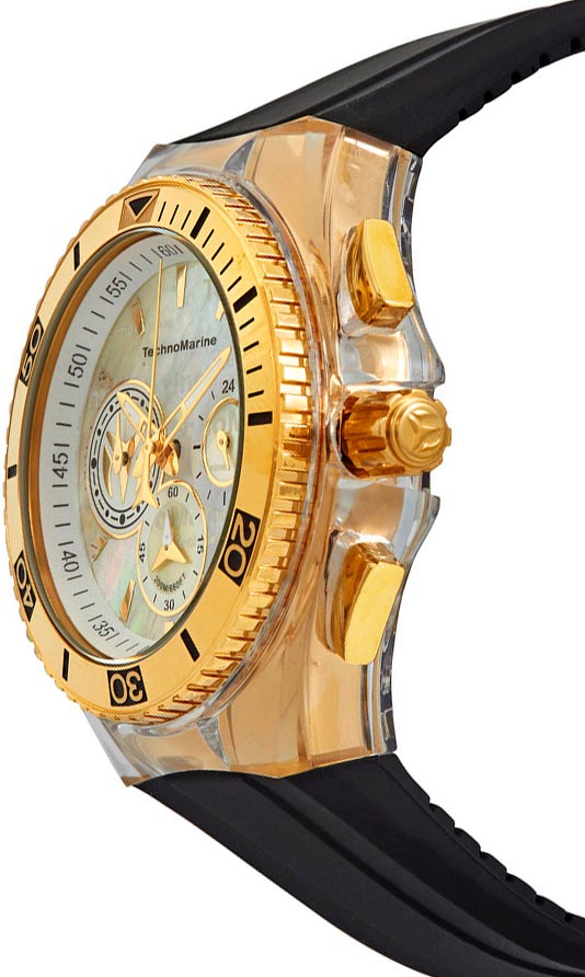 Стильный спортивный дизайн часов для таких мужчин, которые лидируют по жизни. Время выбирает своих фаворитов. Мужские наручные часы-хронограф Cruise California с секундомером. 12-ти и 24-х часовой формат времени. Круглый стальной корпус с прозрачной силиконовой накладкой. Безель вращается в одном направлении. Перламутровый циферблат. Накладные метки в виде штрихов. Стрелки с люминесцентным покрытием, которое светится в темноте после непродолжительной зарядки на свету. Завинчивающаяся заводная головка с защитой. Силиконовый ремешок с классической застежкой. Имеется женский вариант модели TM120030.