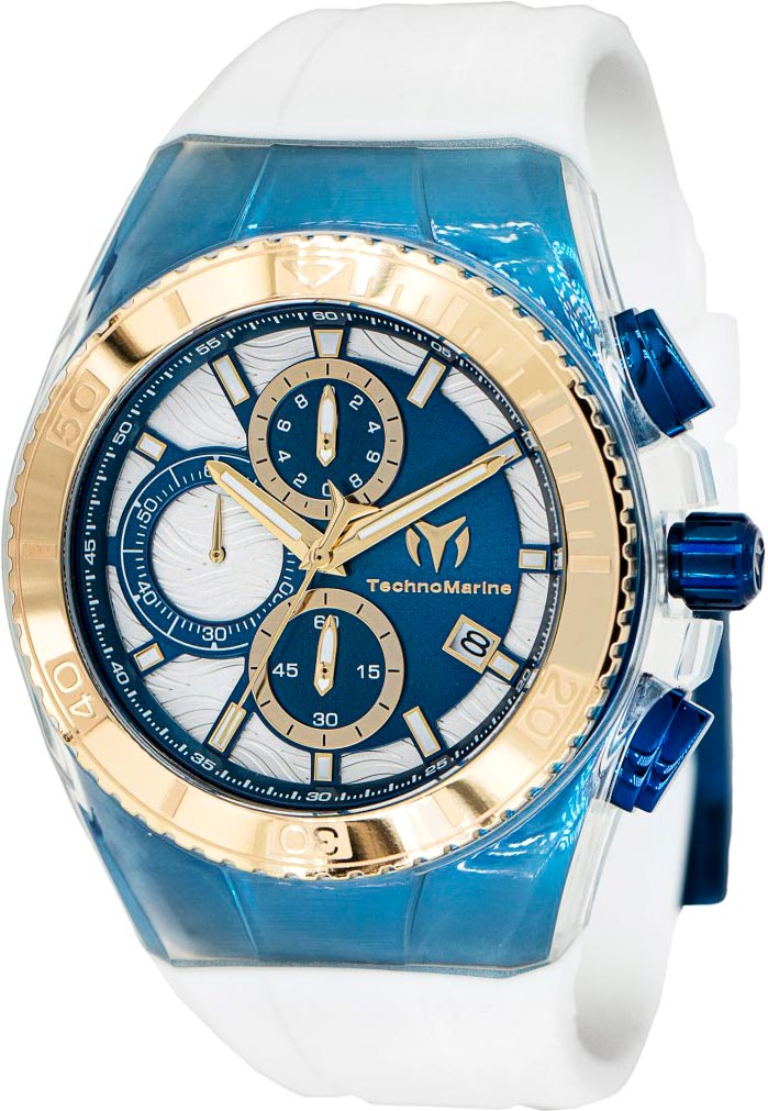 Яркий облик спортивный часов придется по вкусу молодым и активным мужчинам. Мужские наручные часы-хронограф Cruise Chronograph с секундомером. Круглый стальной корпус с прозрачной силиконовой накладкой. Безель вращается в одном направлении. Структурный циферблат с логотипом компании ''TechnoMarine''. Накладные метки в виде штрихов. Окошко даты находится в положении 4 часов. Стрелки и метки с люминесцентным покрытием, которое светится в темноте после непродолжительной зарядки на свету. Рифленая завинчивающаяся заводная головка с защитой. Силиконовый ремешок с классической застежкой.