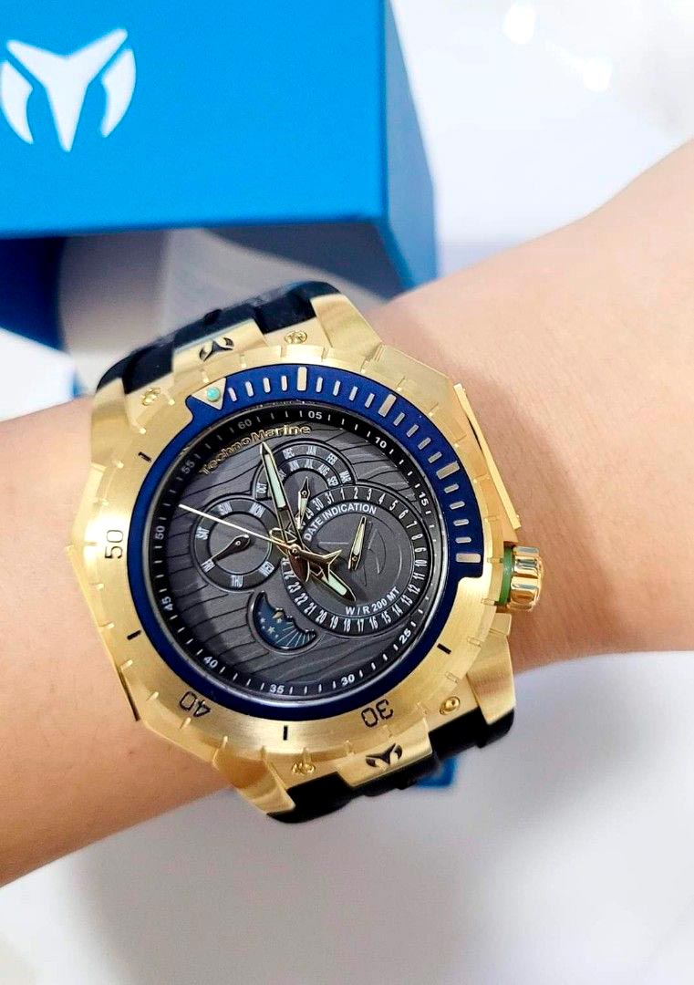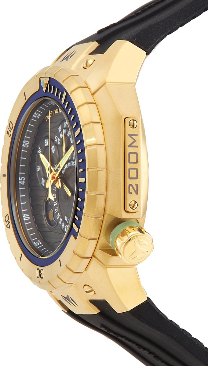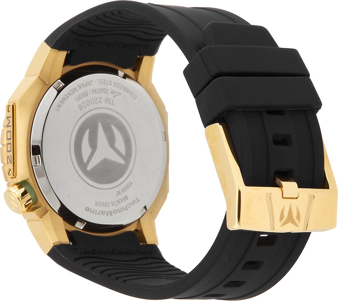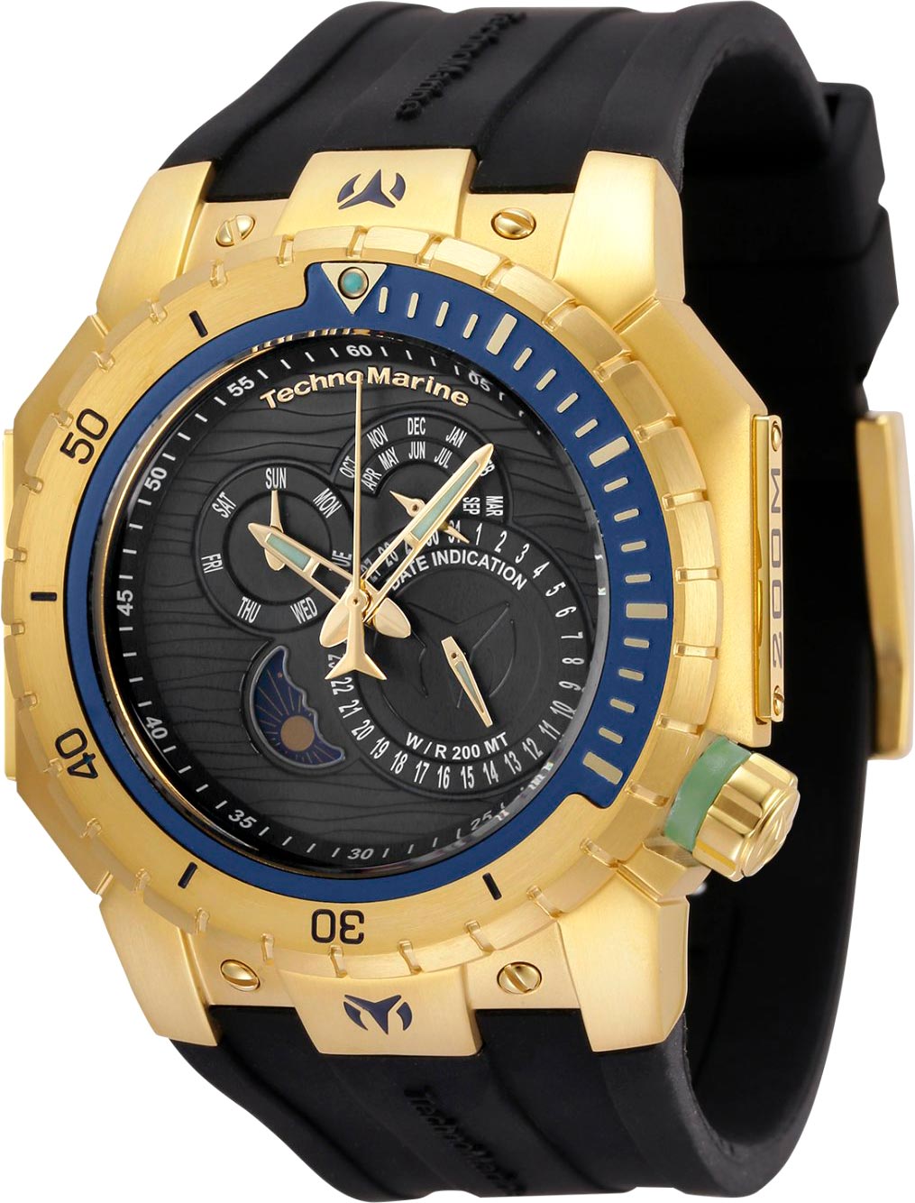 Стильный и функциональный циферблат придает этим часам непередаваемое очарование. Идеальное дополнение вашего безупречного стиля. Мужские наручные часы Manta Sea. Стальной корпус необычной формы. Безель вращается в одном направлении. Циферблат со структурой волн и логотипом компании ''TechnoMarine''. Дата, день недели и месяц расположены на отдельных сабдиалах. Индикатор день/ночь. Стрелки с люминесцентным покрытием, которое светится в темноте после непродолжительной зарядки на свету. Рифленая завинчивающаяся заводная головка с защитой смещена в низ. Силиконовый ремешок с классической застежкой.