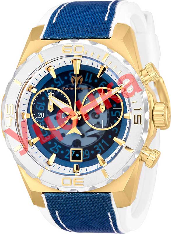 Мужские наручные часы-хронограф Reef Shark с секундомером. Круглый стальной корпус. Безель вращается в одном направлении. Прозрачный матовый двухуровневый циферблат с логотипом компании ''TechnoMarine''. Накладные метки в виде штрихов. Окошко даты находится в положении 6 часов. Стрелки с люминесцентным покрытием, которое светится в темноте после непродолжительной зарядки на свету. Рифленая завинчивающаяся заводная головка. Силиконовый ремешок с нейлоновой вставкой. Классическая застежка.