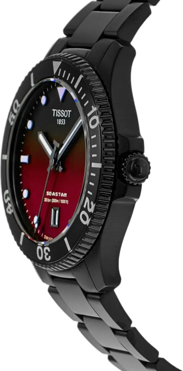 Мужские наручные часы T-Sport Seastar 1000. В механизме 3 камня. Круглый стальной корпус. Рифленый вращающийся в одном направлении безель. Градиентный красно-черный циферблат защищен сапфировым стеклом с двусторонним антибликовым покрытием.