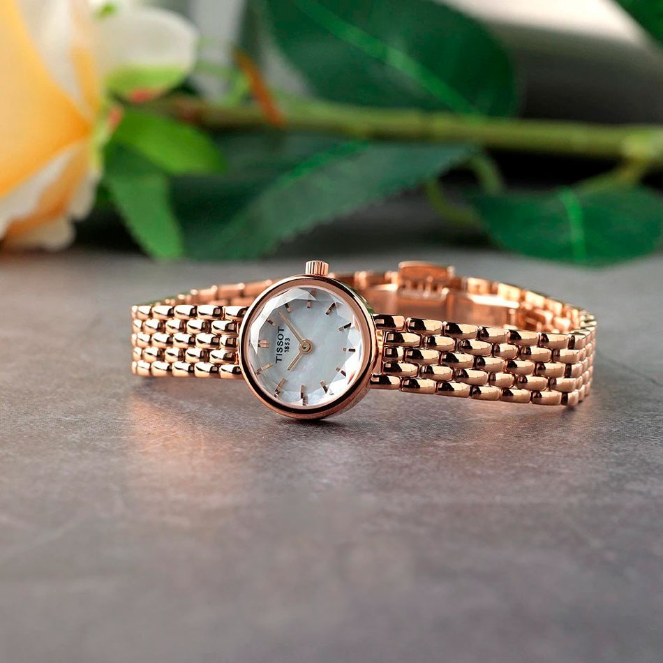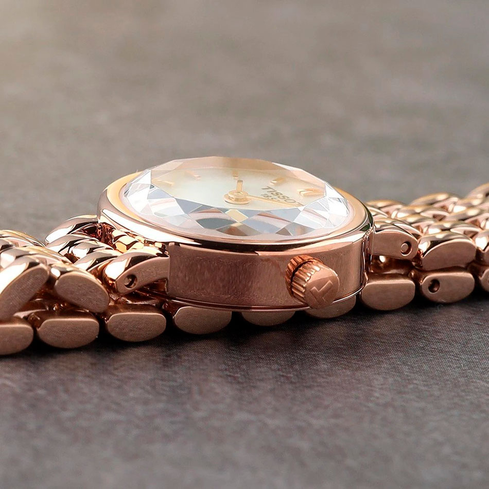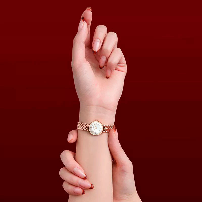Женские наручные часы Lovely Round. Круглый стальной корпус с сапфировым стеклом. Перламутровый циферблат. Прямоугольные стрелки в стиле Baton. Секундная стрелка отсутствует. Метки в виде штрихов. Рифленая заводная головка. Надежный стальной браслет с застежкой-бабочкой.