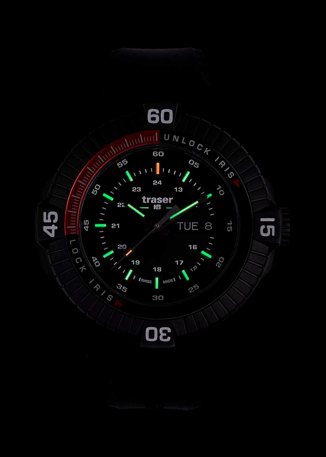 TrigaLight-подсветка на основе тритиевого газа не тускнеет в течение длительного использования (ресурс до 25 лет). Заостренные прямоугольные стрелки в стиле Baton. Заводная головка с защитой. Индивидуальный номер, выгравированный на задней крышке. Каучуковый ремешок с классической застежкой.