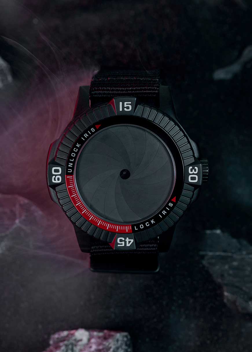 Массивный двунаправленный безель с 60-минутной шкалой. Вращение безеля открывает или закрывает 16-лепестковую диафрагму, которая защищает циферблат. Лепестки диафрагмы не требуют обслуживания и гарантируют надежную работу. 12-ти и 24-х часовой формат времени.