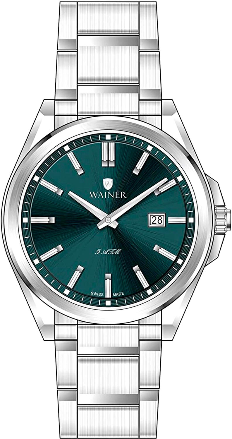 Наручные мужские кварцевые часы. Круглый стальной корпус с матовой и полированной отделкой. Циферблат выполнен по технологии Sunray (солнечные лучи) и украшен фирменным логотипом Wainer. Накладные метки в виде штрихов.