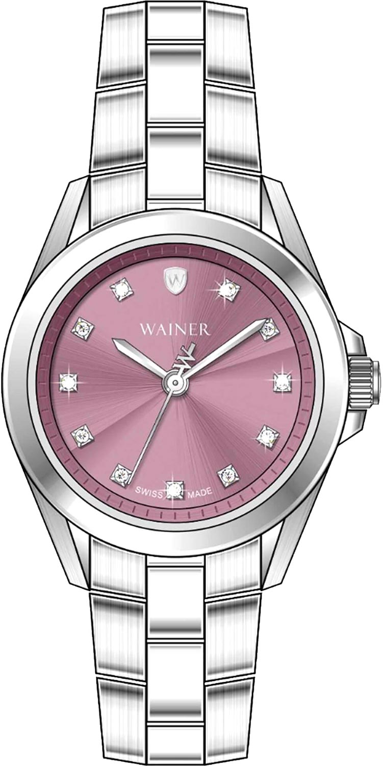Женские наручные кварцевые часы. Круглый стальной корпус с матовой и полированной отделкой. Циферблат выполнен по технологии Sunray (солнечные лучи) и украшен фирменным логотипом Wainer. Накладные метки в виде точек, украшенных фианитами.