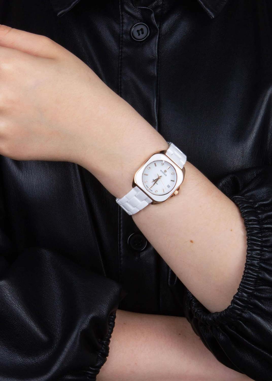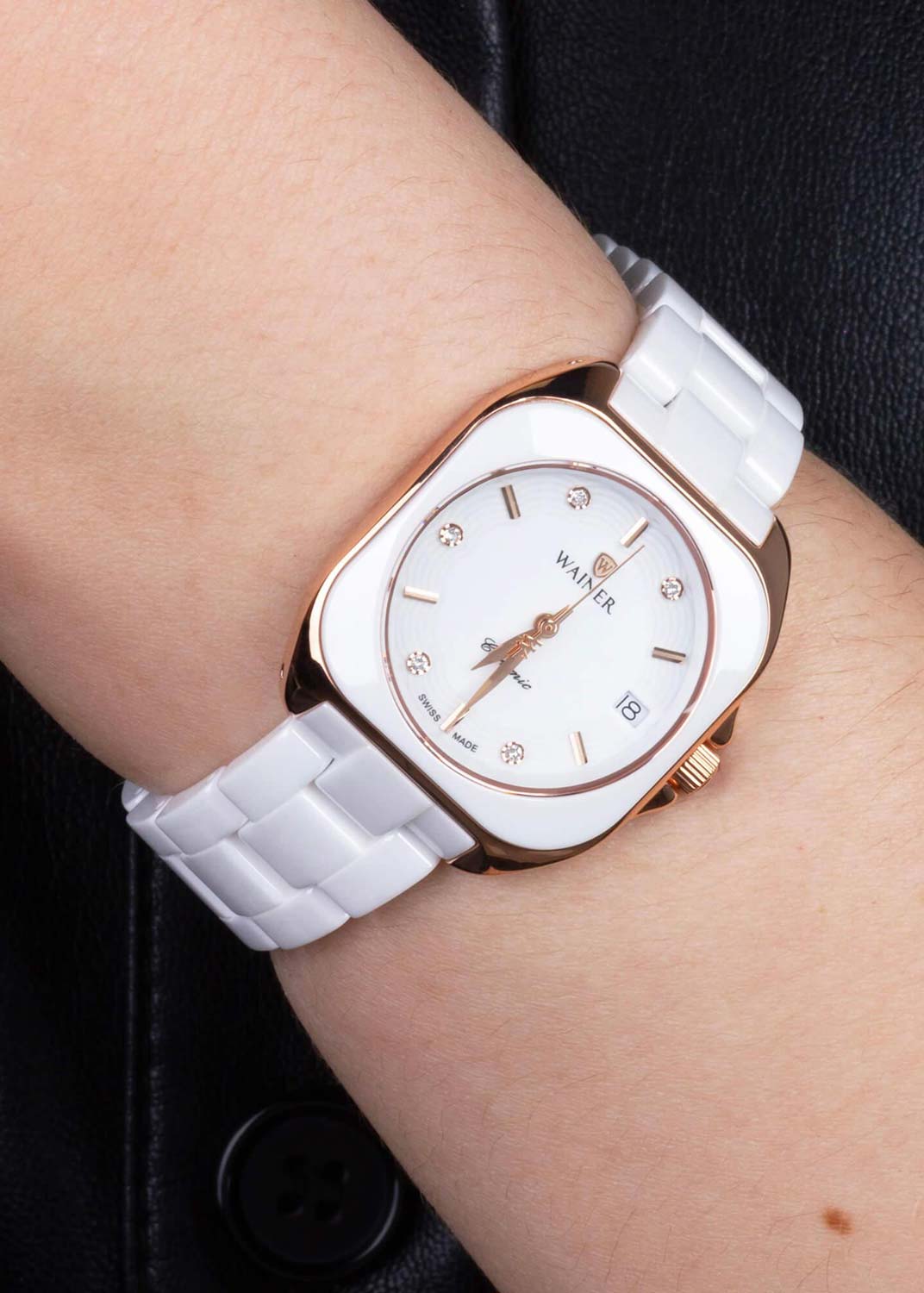 Женские наручные часы. Квадратный стальной корпус с керамической вставкой. Гильошированный в зоне меток циферблат дополнен логотипом бренда. Метки в виде штрихов и точек с фианитами. Листовидные стрелки в стиле Feuille. Секундная стрелка на конце декорирована буквой W.