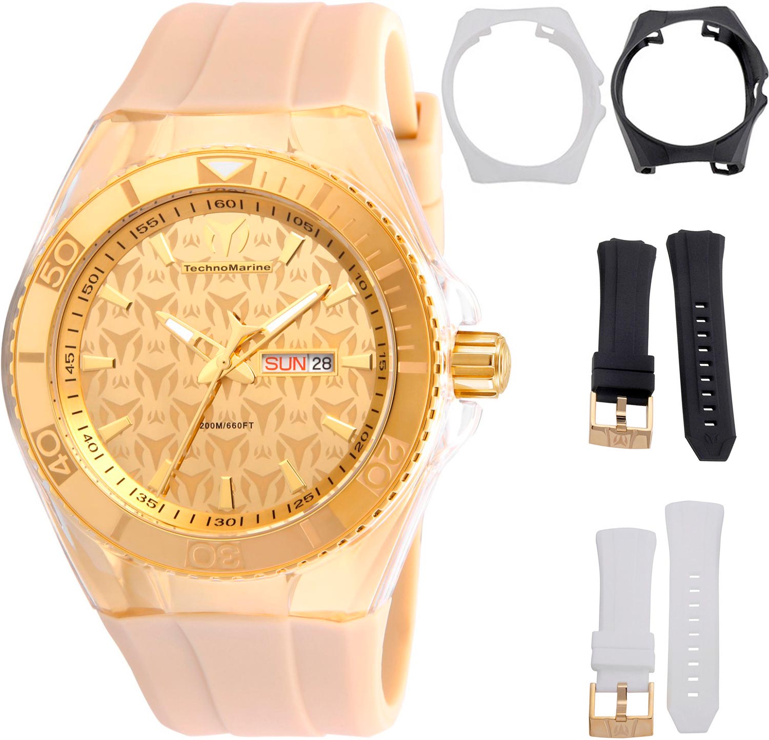 Неповторимый стиль этих часов послужит отправной точкой в создании активного образа. Практичные мужские наручные часы Cruise Monogram. Круглый стальной корпус с прозрачной силиконовой накладкой. Безель вращается в одном направлении. Брендированный циферблат выполнен по технологии Sunray (солнечные лучи) с логотипом компании TechnoMarine. Накладные метки в виде штрихов. Окошко даты и дня недели находится в положении 3 часа. Стрелки с люминесцентным покрытием, которое светится в темноте после непродолжительной зарядки на свету. Рифленая завинчивающаяся заводная головка с защитой. Силиконовый ремешок с классической застежкой. В комплекте два сменных покрытия корпуса белого и черного цветов и два силиконовых ремешка белого и черного цветов.