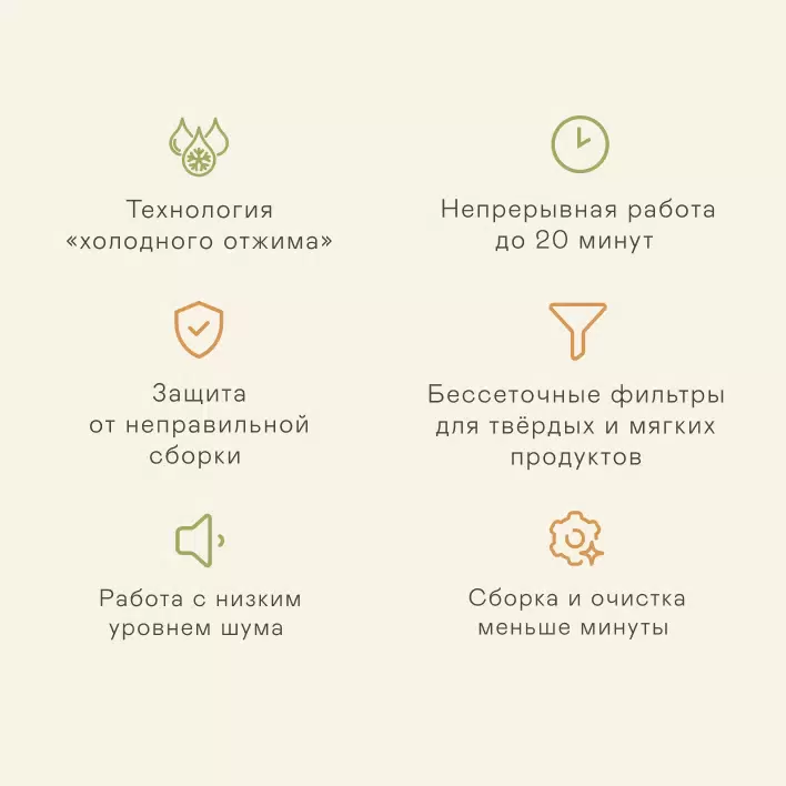 - Комплект поставки1. Соковыжималка - 1шт 2. Кувшин для сока - 1шт 3. Контейнер для жмыха - 1шт 4. Толкатель - 1шт 5. Фильтр для мягких продуктов - 1шт 6. Фильтр для твердых продуктов - 1шт 7. Щетка для очистки - 1шт 8. Руководство пользователя - 1шт 9. Краткая инструкция пользователя - 1шт 10. Гарантийный талон - 1шт