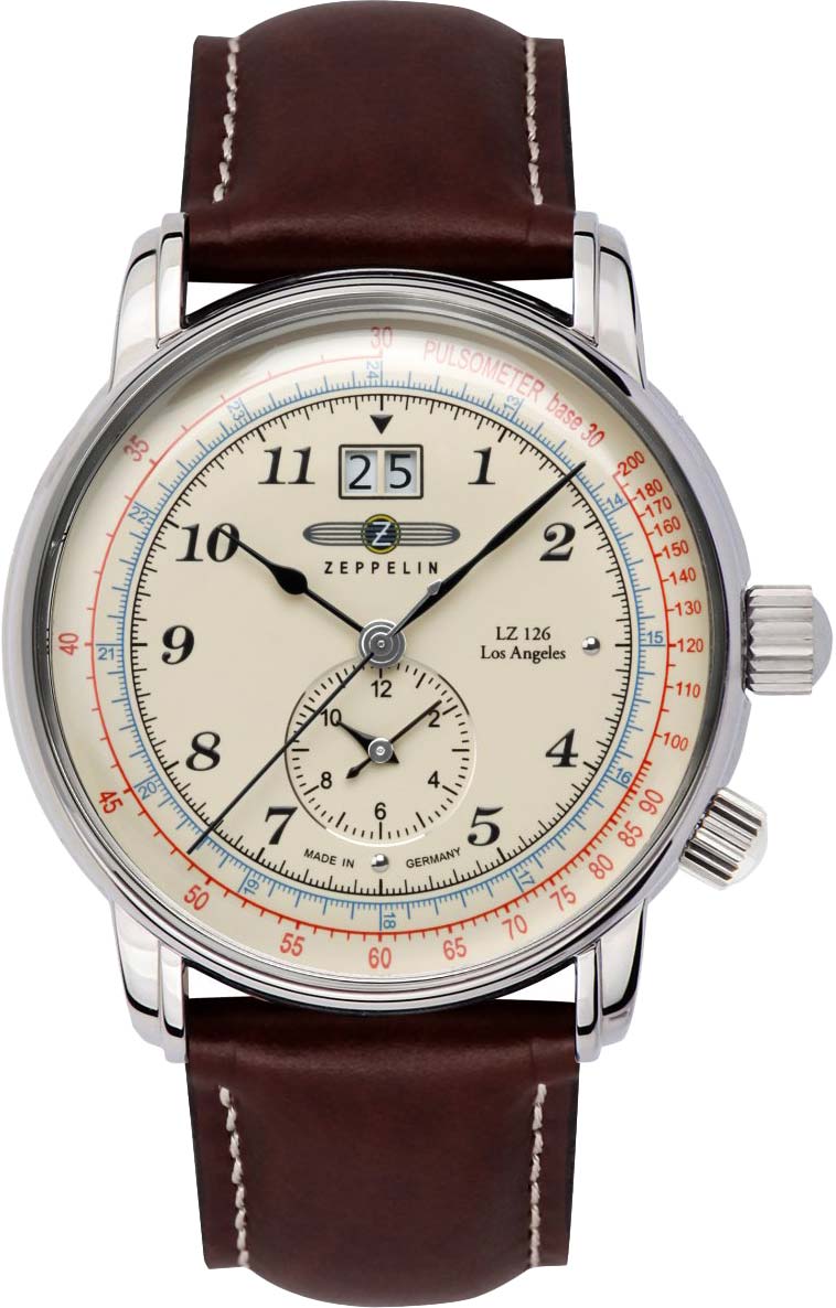 Многофункциональные часы с классическими чертами выбирают стильные и решительные мужчины. LZ126 Los Angeles. Часы со шкалой пульсометра. Второй часовой пояс отображается на отдельном циферблате. 12-ти и 24-х часовой формат времени. Метки в виде арабских цифр. Окошко даты. Ремешок с классической застежкой.