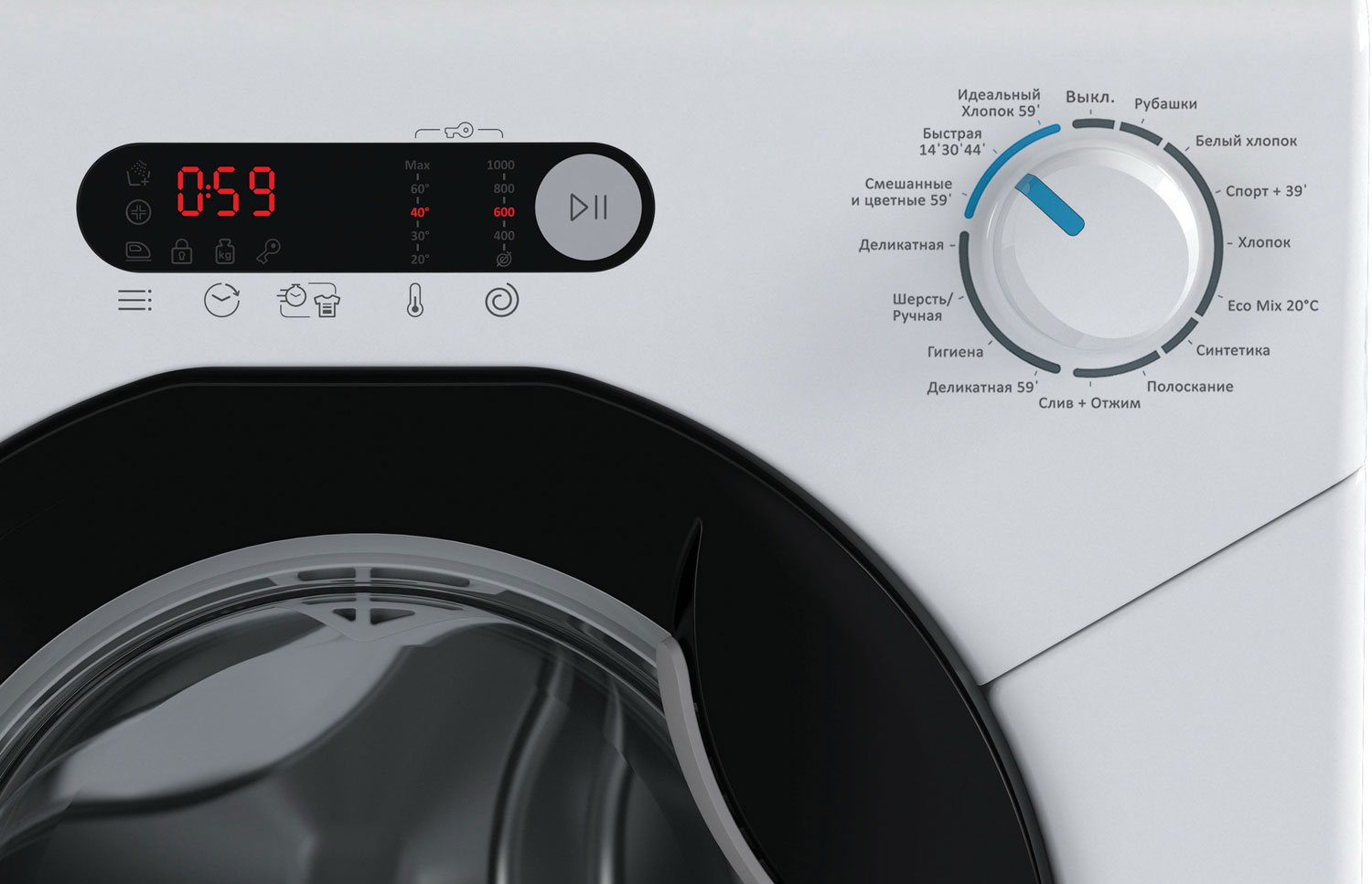- Программы стиркиШерсть/Ручная Белый хлопок Хлопок Быстрая 44 мин Быстрая 30 мин Быстрая 14 мин Деликатная Смешанные и цветные 59- Программа Eco mix 20° Слив + Отжим Синтетика Полоскание Смешанные и цветные ткани 59 минут Хлопок: идеальная 59 минут Гигиена Спорт+ 39 мин Рубашки