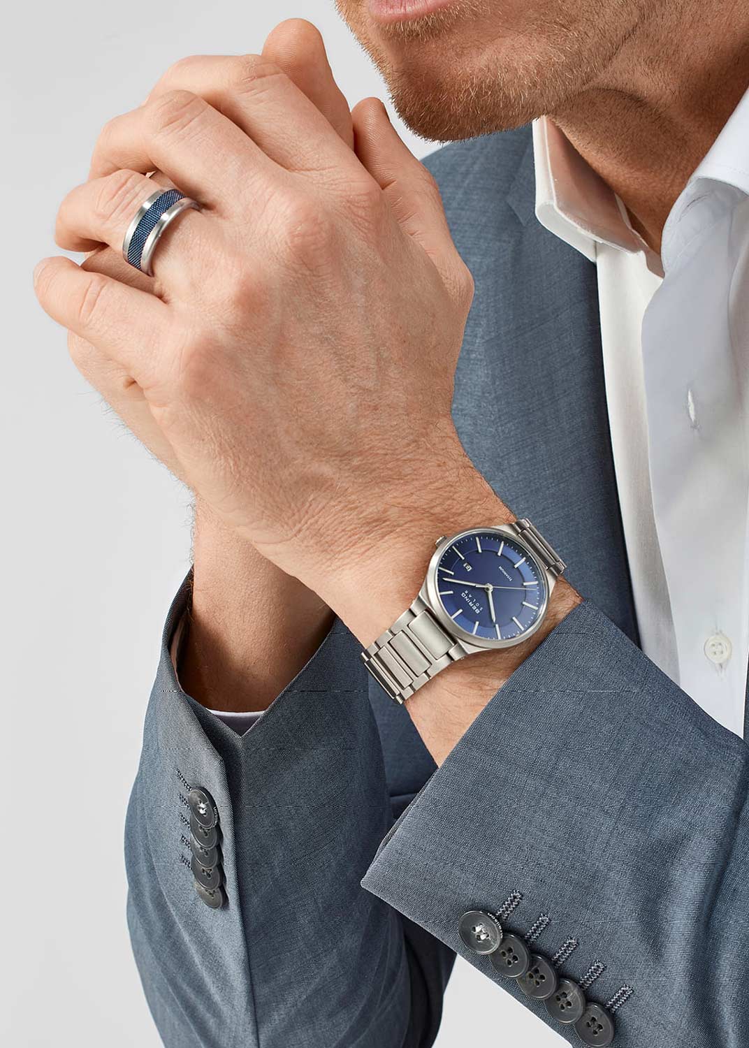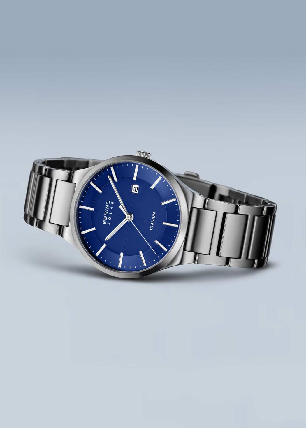 Мужские наручные часы. Питание от солнечной энергии. Круглый титановый корпус с сатинированной поверхностью. Циферблат защищен прочным сапфировым стеклом. Метки в виде штрихов. Окошко даты находится в положении 3 часа.