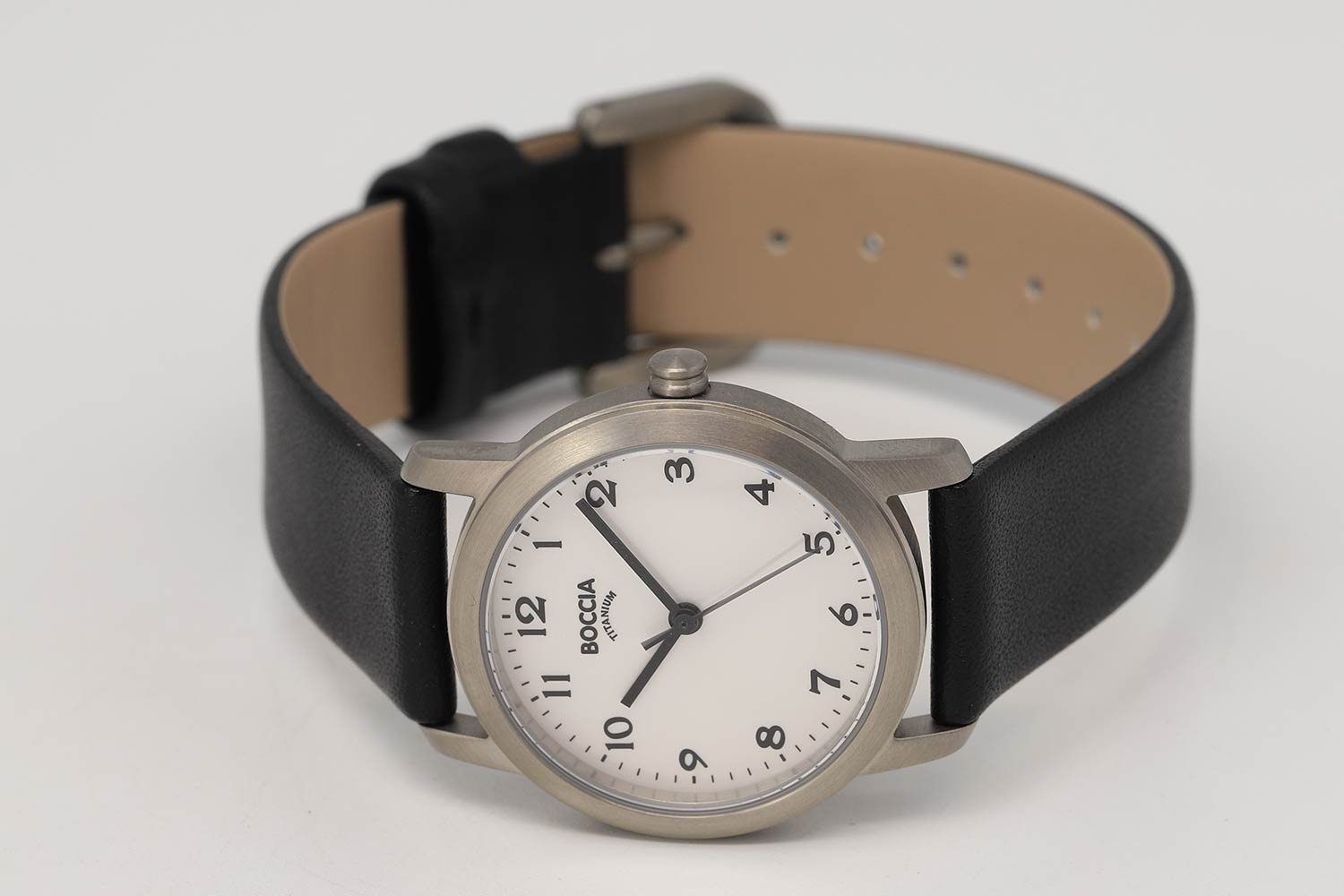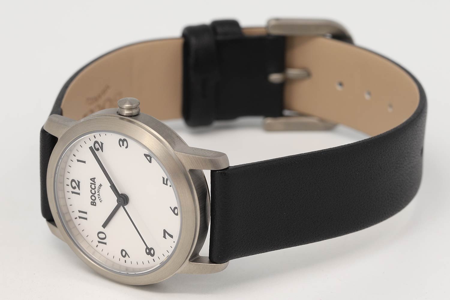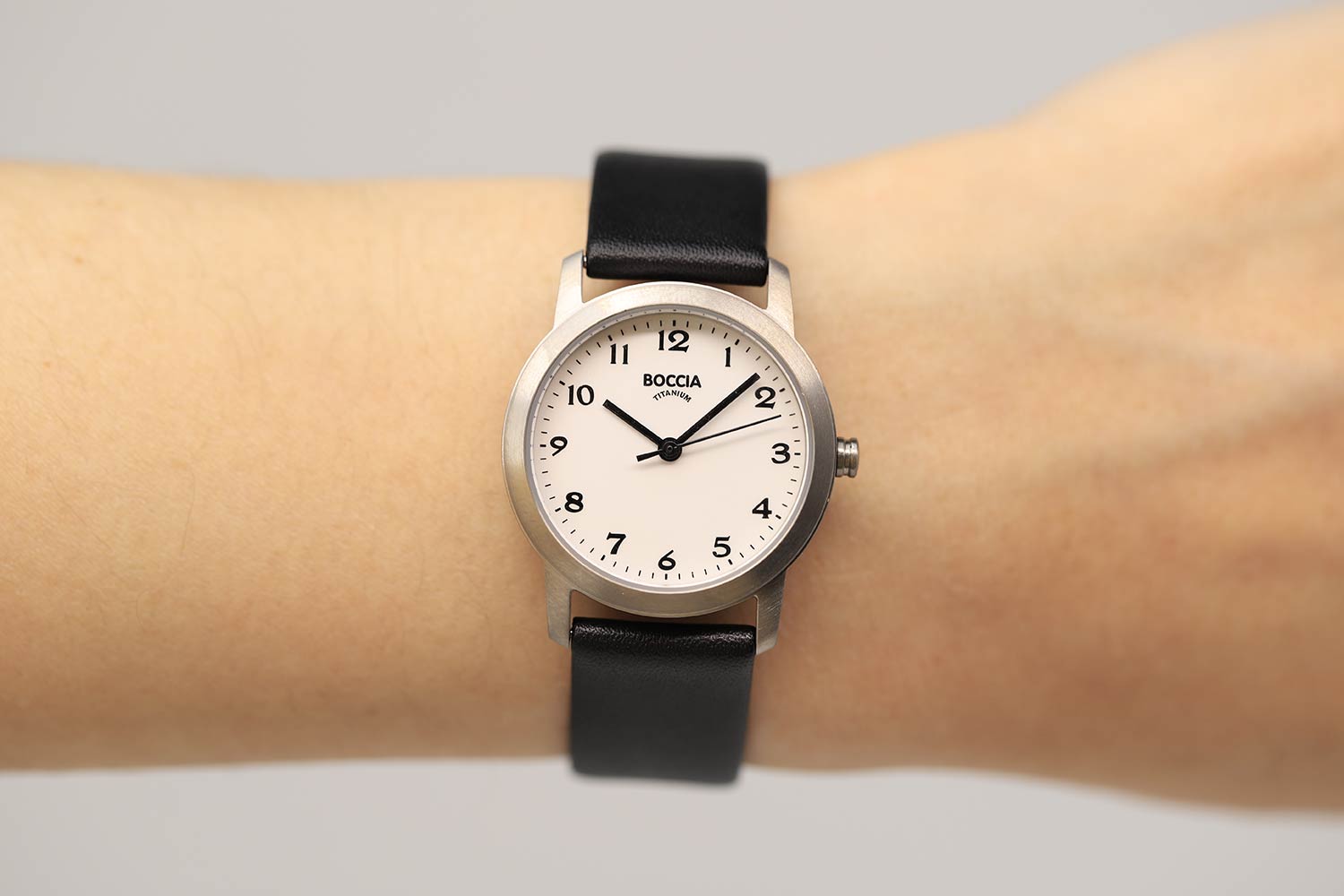 Женские наручные часы. Круглый титановый корпус. Циферблат с метками в виде арабских цифр защищен минеральным стеклом. Гладкая заводная головка. Кожаный ремешок с классической застежкой. Имеется мужской вариант модели 3617-01.