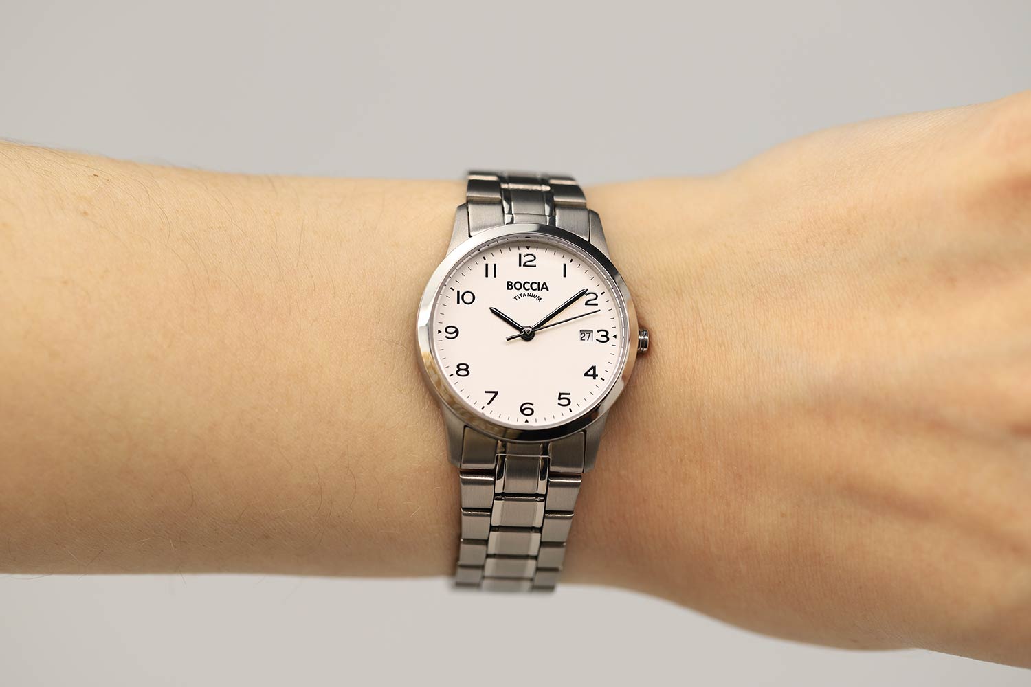 Отточенный и лаконичный дизайн этого аксессуара не оставит вас равнодушной. Прекрасный выбор на каждый день. Классические женские наручные часы. Круглый корпус из титана. Белый циферблат с метками в виде арабских цифр. Окошко даты находится в положении 3 часа. Браслет с раскладывающейся застежкой.