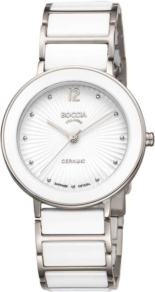 Женские наручные часы Ceramic. Круглый титановый корпус с керамической вставкой. Текстурный циферблат защищен прочным сапфировым стеклом. Метки в виде точек и арабской цифры 12. Браслет с раскладывающейся застежкой.