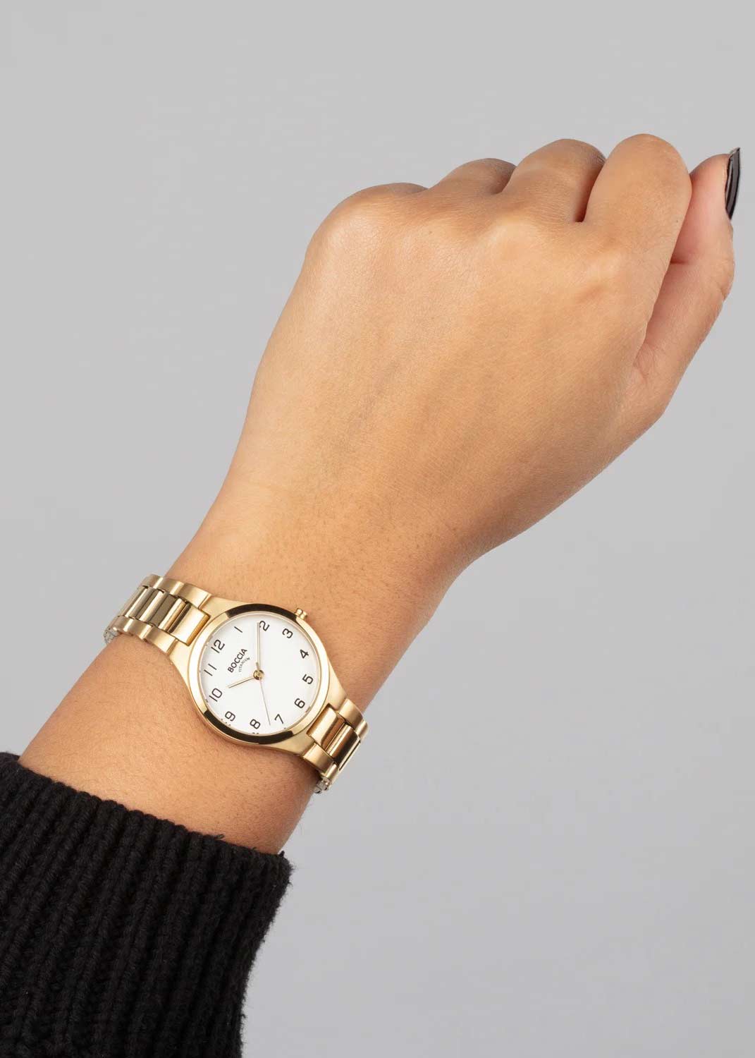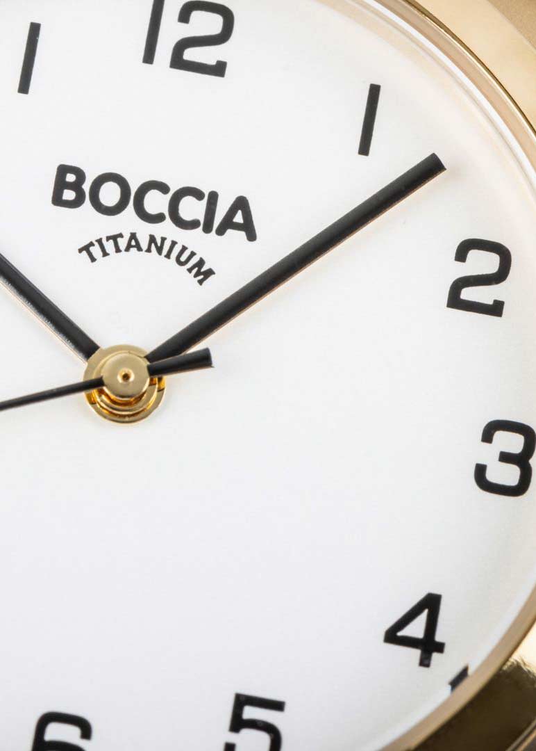 Женские наручные часы. Круглый корпус из титана. Циферблат с метками в виде арабских цифр защищен минеральным стеклом. Гладкая заводная головка. Браслет с раскладывающейся застежкой.