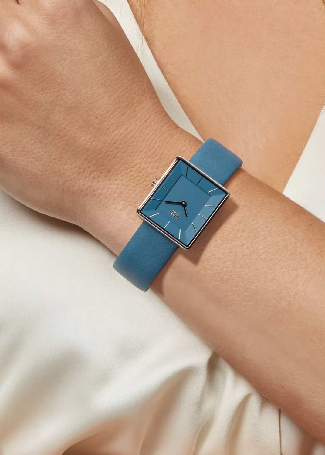 Женские наручные часы. Прямоугольный титановый корпус. Двухуровневый циферблат с метками в виде штрихов защищен минеральным стеклом. Гладкая заводная головка. Ремешок с классической застежкой.