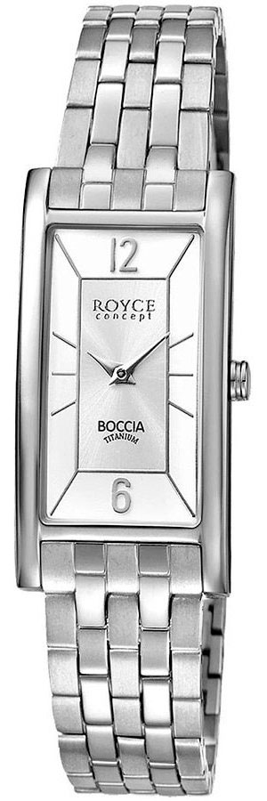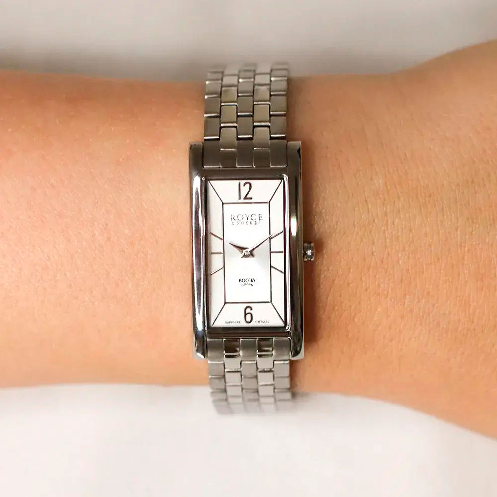 Элегантный дизайн часов выгодно подчеркнет безупречный вкус и имидж их обладательницы. Женские наручные часы Royce. Прямоугольный корпус из титана. Циферблат с метками в виде штрихов и арабских цифр 6, 12. Браслет с раскладывающейся застежкой.