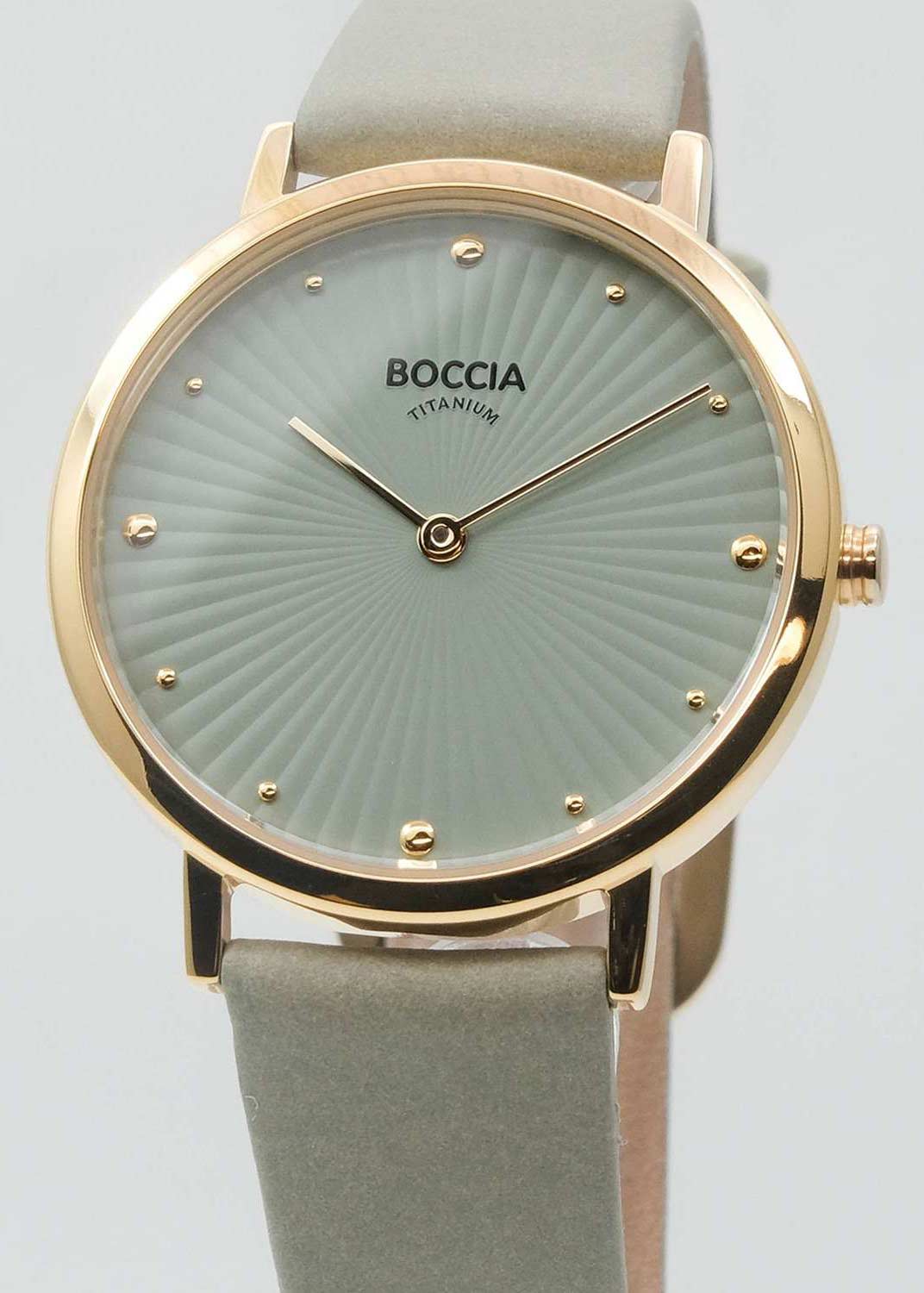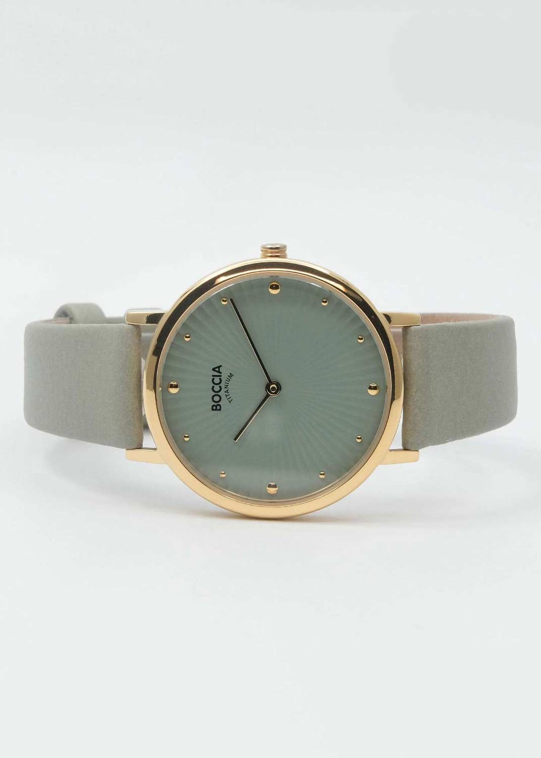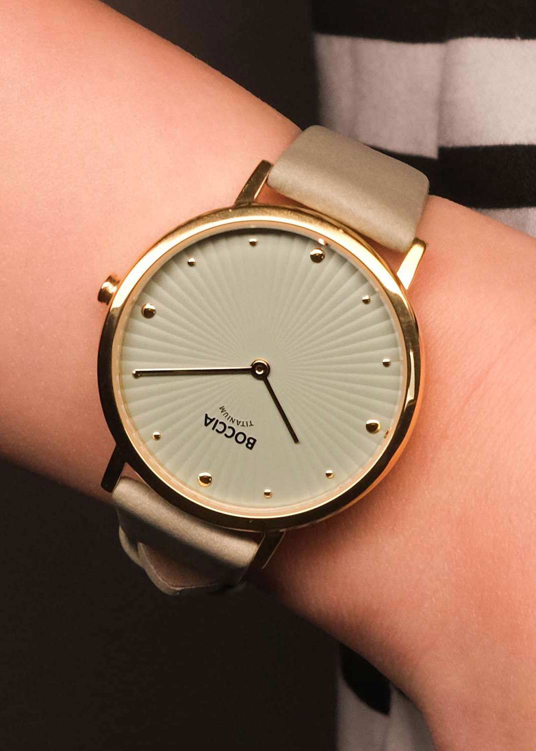 Женские наручные часы. Круглый корпус из титана. Гильошированный циферблат с метками в виде точек защищен минеральным стеклом. Гладкая заводная головка. Кожаный ремешок с классической застежкой.