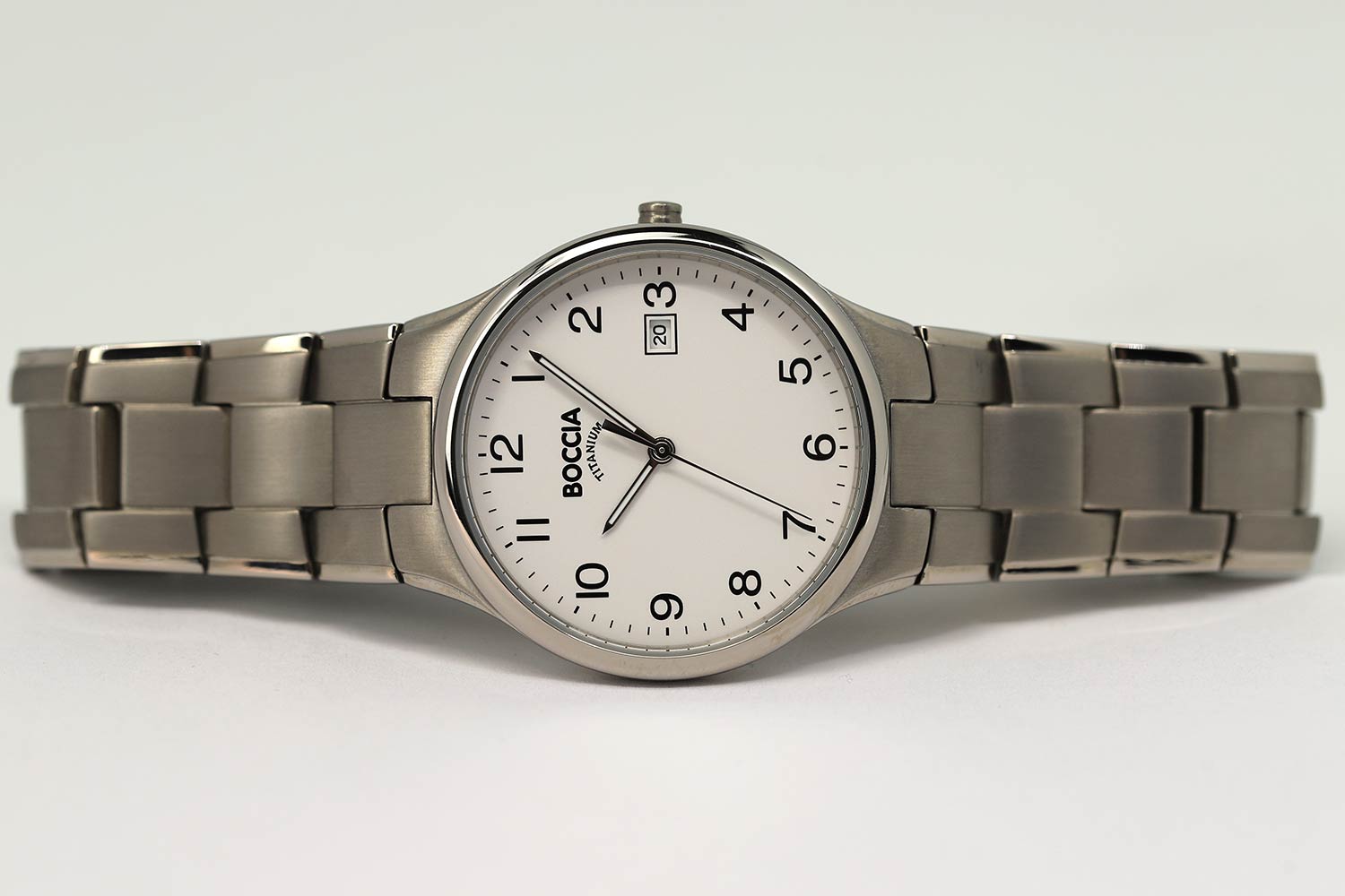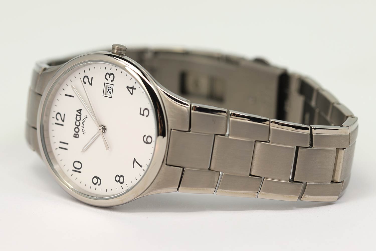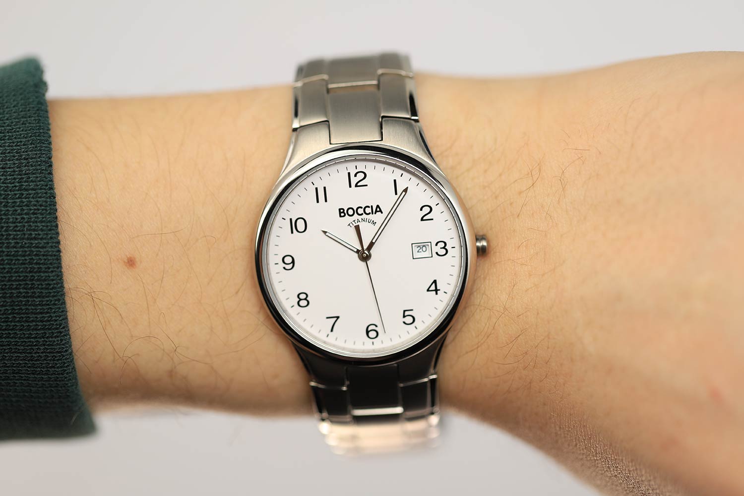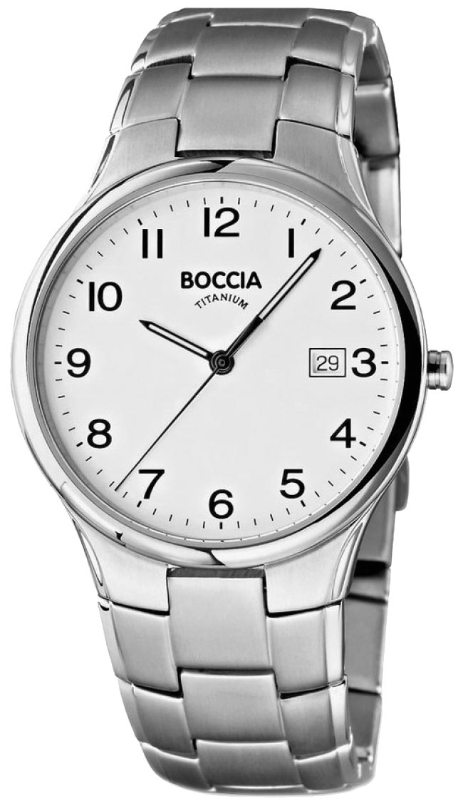 Аксессуар в классическом стиле для элегантных мужчин. Кварцевые наручные часы с круглым корпусом из титана. Циферблат с метками в виде арабских цифр. Окошко даты находится в положении 3 часа. Браслет с раскладывающейся застежкой.