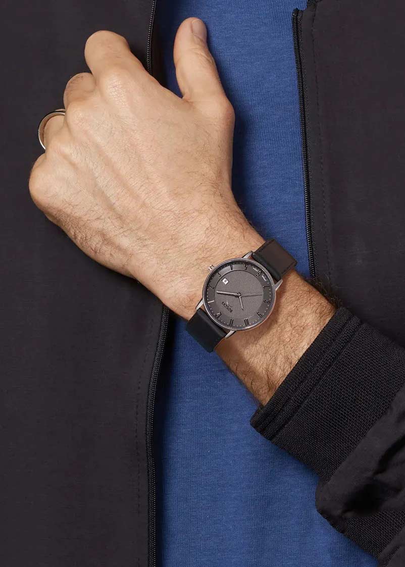 Мужские наручные часы. Круглый корпус из титана. Гильошированный циферблат с метками в виде арабских цифр защищен прочным сапфировым стеклом. Окошко даты находится в положении 3 часа. Гладкая заводная головка. Кожаный ремешок с классической застежкой.