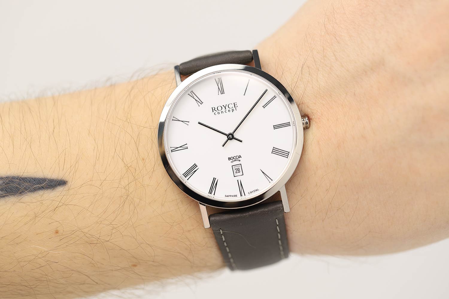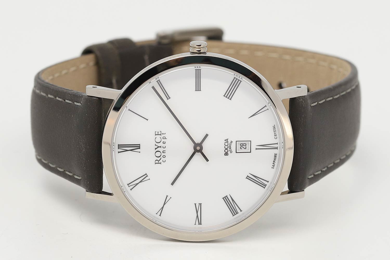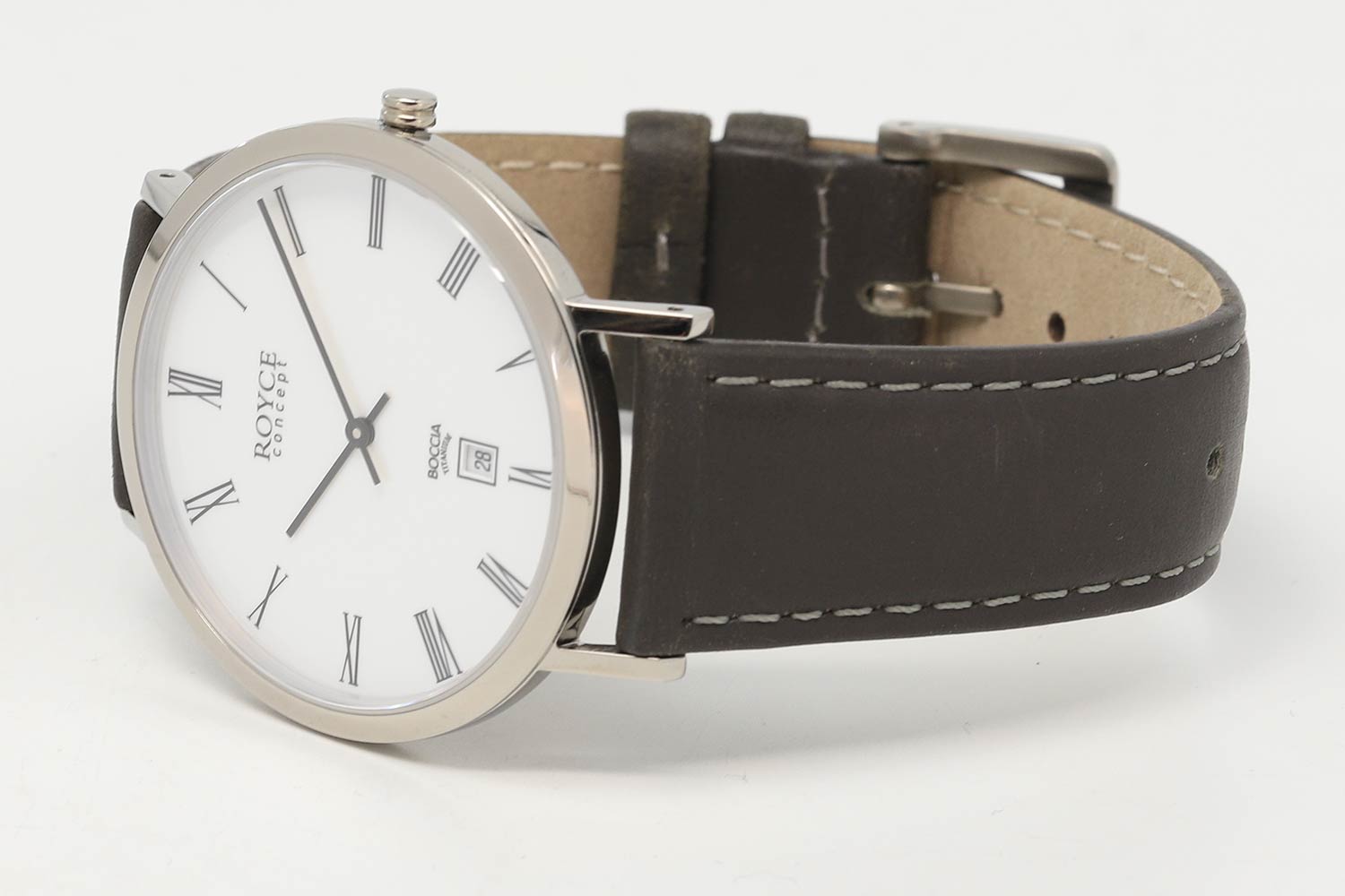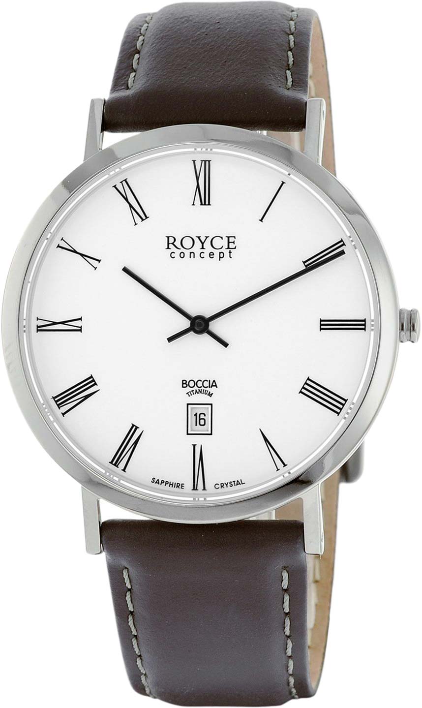 Классический аксессуар с винтажными нотками - неотъемлемый атрибут успешного делового человека. Royce. Мужские часы в круглом титановом корпусе. Метки в виде римских цифр. Окошко даты находится в положении 6 часов. Кожаный ремешок с классической застежкой.