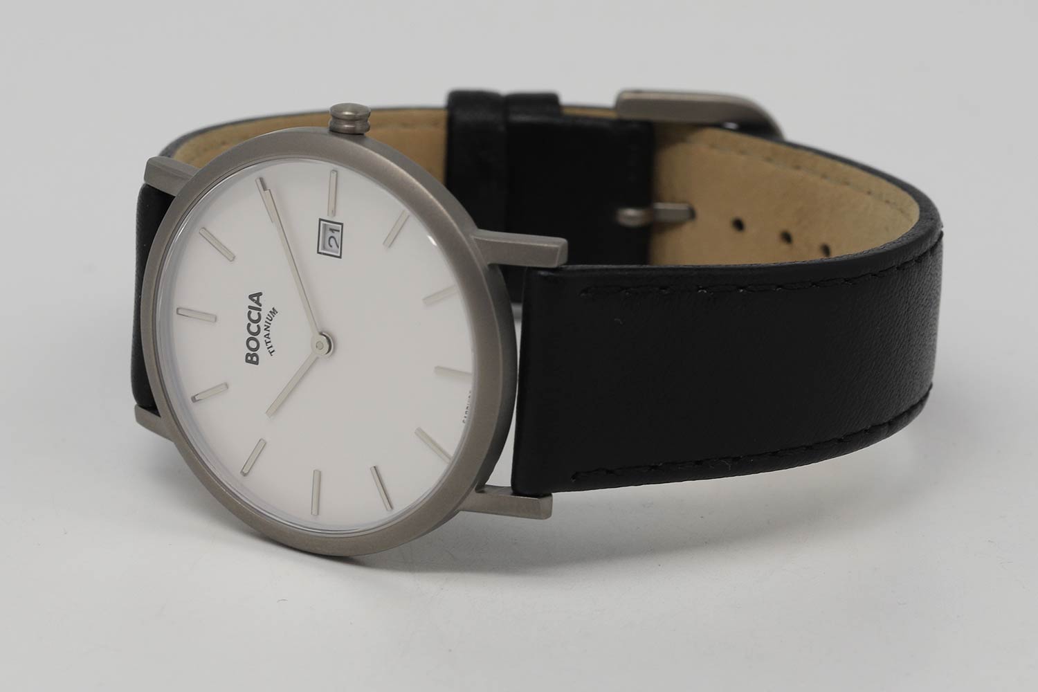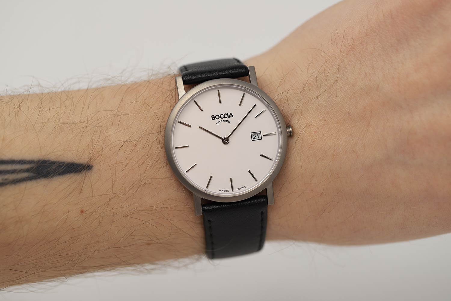 Этот аксессуар станет завершающим штрихом при создании успешного делового образа. Мужские часы в круглом титановом корпусе. Циферблат с метками в виде штрихов. Окошко даты находится в положении 3 часа. Кожаный ремешок с классической застежкой.