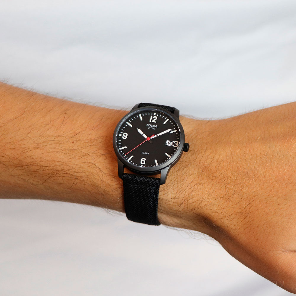 Удобные и практичные часы для стильных мужчин, знающих цену времени. Мужские часы с круглым корпусом. Метки в виде штрихов и арабских цифр. Окошко даты в положении 3 часа. Тканевый ремешок на кожаной основе.