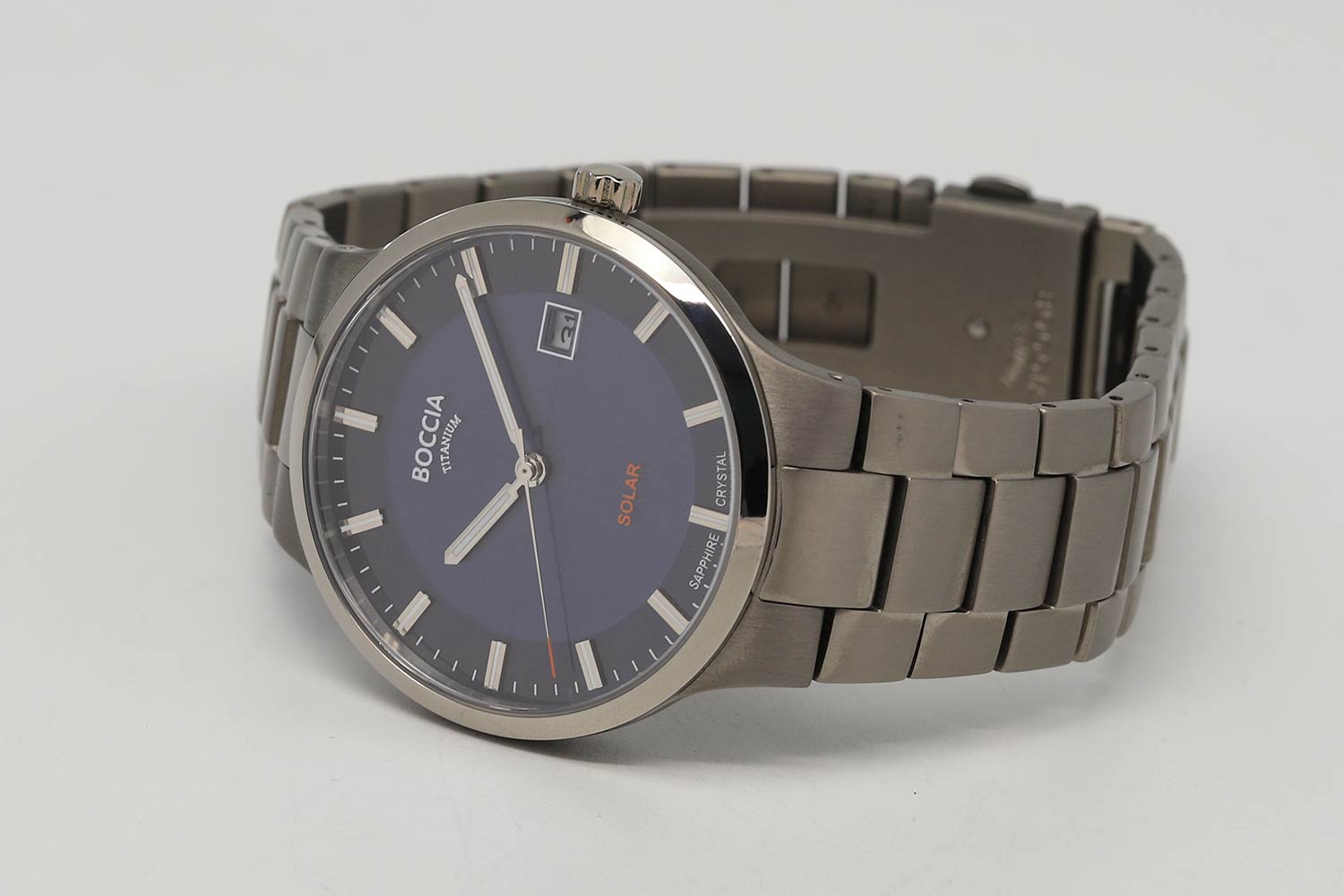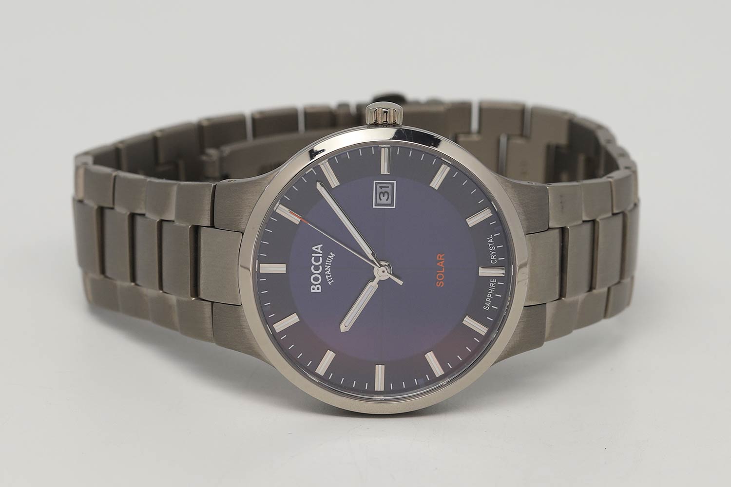 Мужские часы. Питание от солнечной энергии. Циферблат с метками в виде штрихов выполнен по технологии Sunray (солнечные лучи). Окошко даты. Браслет с раскладывающейся застежкой.