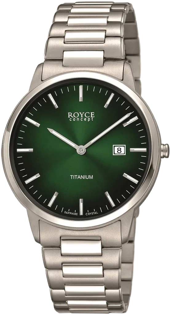 Этот аксессуар – самое лучшее дополнение к классическому костюму. Royce. Мужские наручные часы. Круглый корпус из титана. Циферблат с метками в виде штрихов выполнен по технологии Sunray (солнечные лучи). Окошко даты находится в положении 3 часа. Браслет с раскладывающейся застежкой.