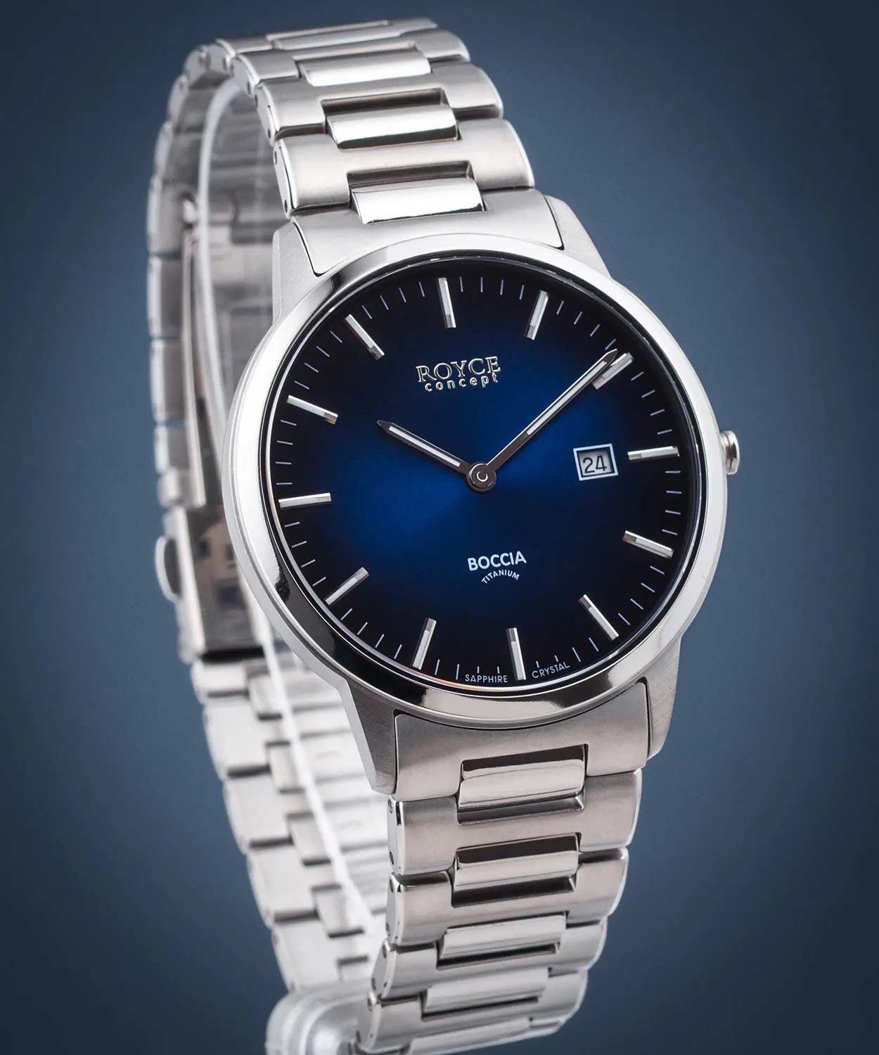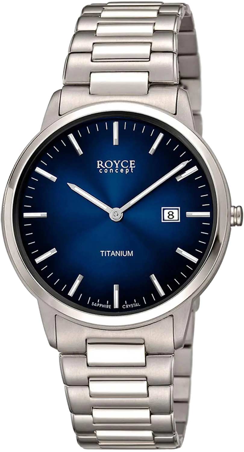 Этот аксессуар – самое лучшее дополнение к классическому костюму. Royce. Мужские наручные часы. Круглый корпус из титана. Циферблат с метками в виде штрихов выполнен по технологии Sunray (солнечные лучи). Окошко даты находится в положении 3 часа. Браслет с раскладывающейся застежкой.