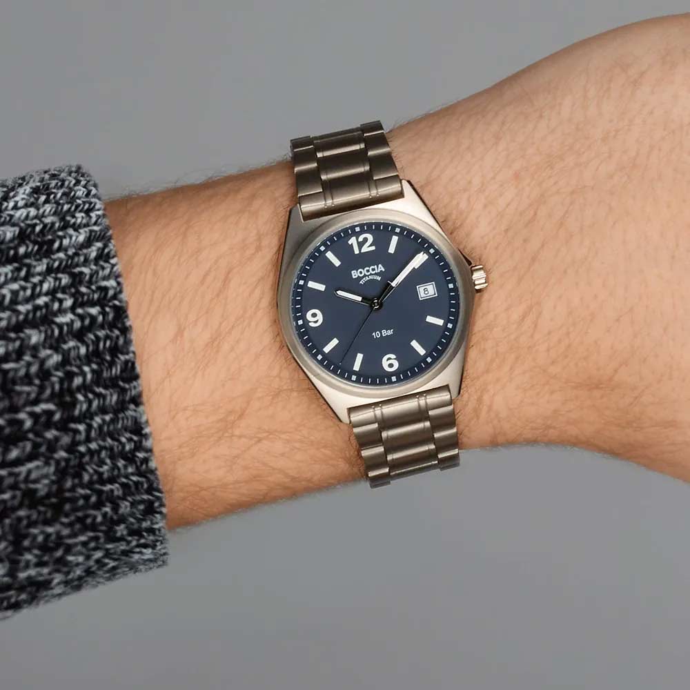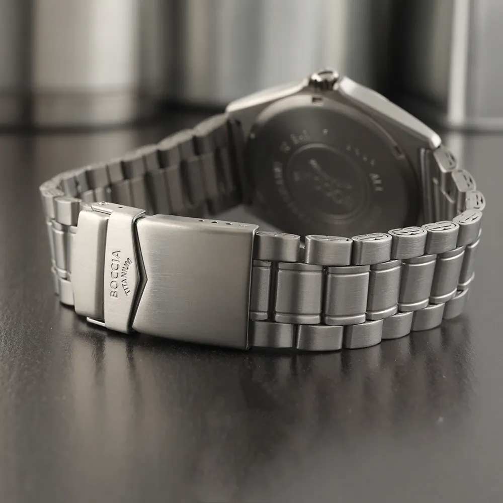 Практичный и функциональные дизайн делает этот аксессуар незаменимым спутником на каждый день. Мужские наручные часы. Круглый корпус из титана. Циферблат с метками в виде штрихов и арабских цифр. Окошко даты находится в положении 3 часа. Рифленая заводная головка с защитой. Браслет с раскладывающейся застежкой.