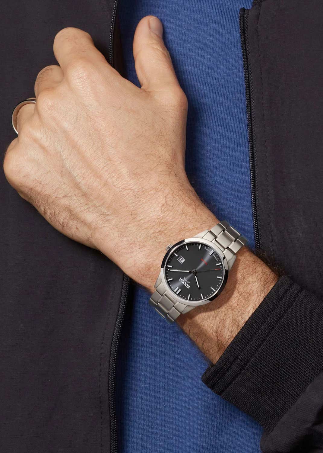 Окошко даты находится в положении 3 часа. Рифленая заводная головка. Браслет с раскладывающейся застежкой.