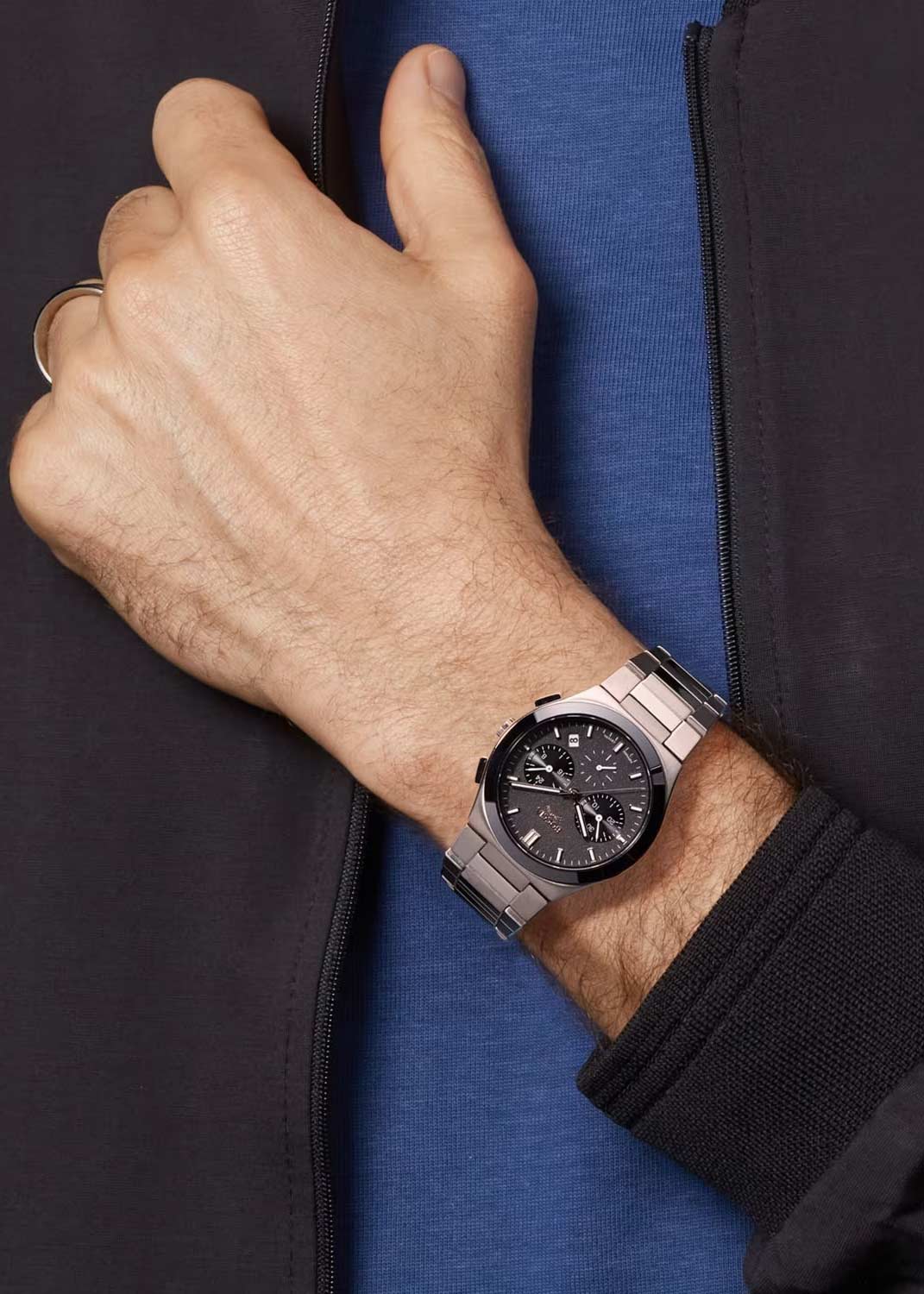 Часы-хронограф с секундомером. 12-ти и 24-х часовой формат времени. Круглый стальной корпус. Зернистый циферблат с метками в виде штрихов защищен прочным сапфировым стеклом.